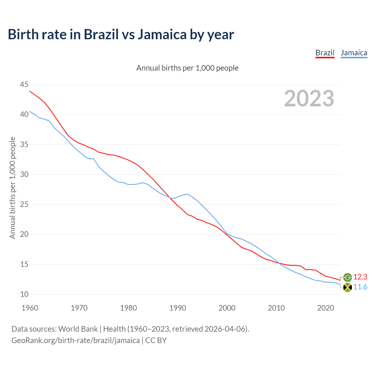 Brazil has an annual birth rate of 12.3 births per 1,000 people, compared to 11.6 for Jamaica. The average number of children a woman is expected to have during her lifetime — the fertility rate, is 1.62 in Brazil and 1.36 in Jamaica — 16.1% difference.