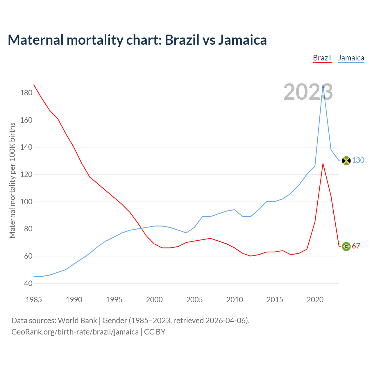 The maternal mortality rate, which is the probability of dying during childbirth or within 42 days of pregnancy termination, is 67 deaths per 100,000 live births in Brazil, compared to 130 deaths in Jamaica.