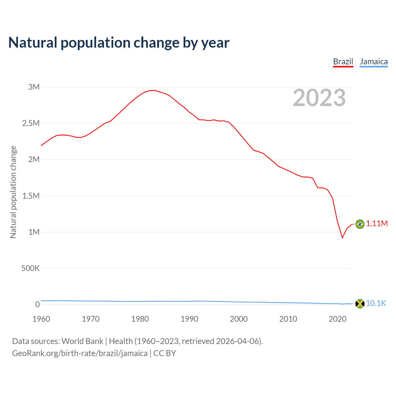 1960 vs 2023, the fertility rate has decreased by 73.2% in Brazil and by 75.5% in Jamaica — in 1960, it was 6.05 and 5.54, respectively.
