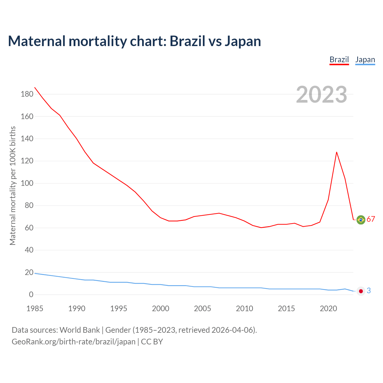 The maternal mortality rate, which is the probability of dying during childbirth or within 42 days of pregnancy termination, is 67 deaths per 100,000 live births in Brazil, compared to 3 deaths in Japan.