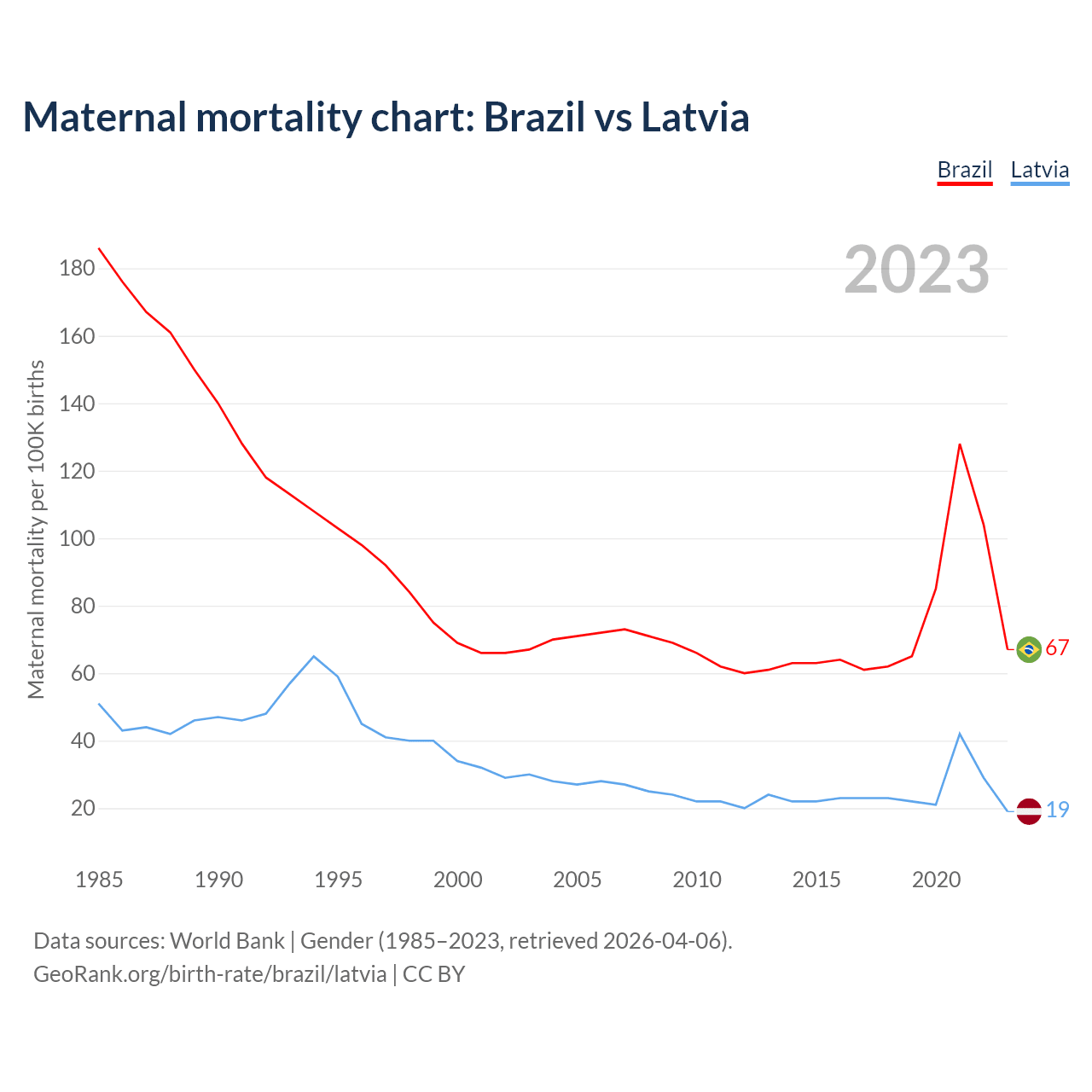 The maternal mortality rate, which is the probability of dying during childbirth or within 42 days of pregnancy termination, is 67 deaths per 100,000 live births in Brazil, compared to 19 deaths in Latvia.