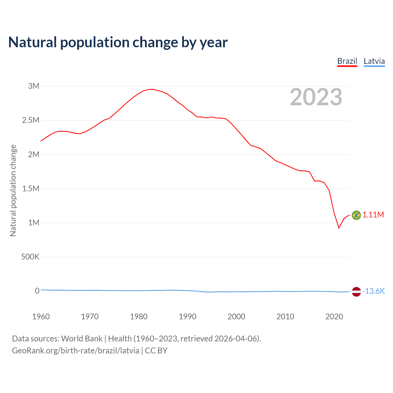 According to the latest available data on birth rates, the fertility rate in Brazil was 1.62 children per woman in 2023, compared to 1.36 in Latvia in 2023. The replacement level is considered to be 2.1 children per woman.