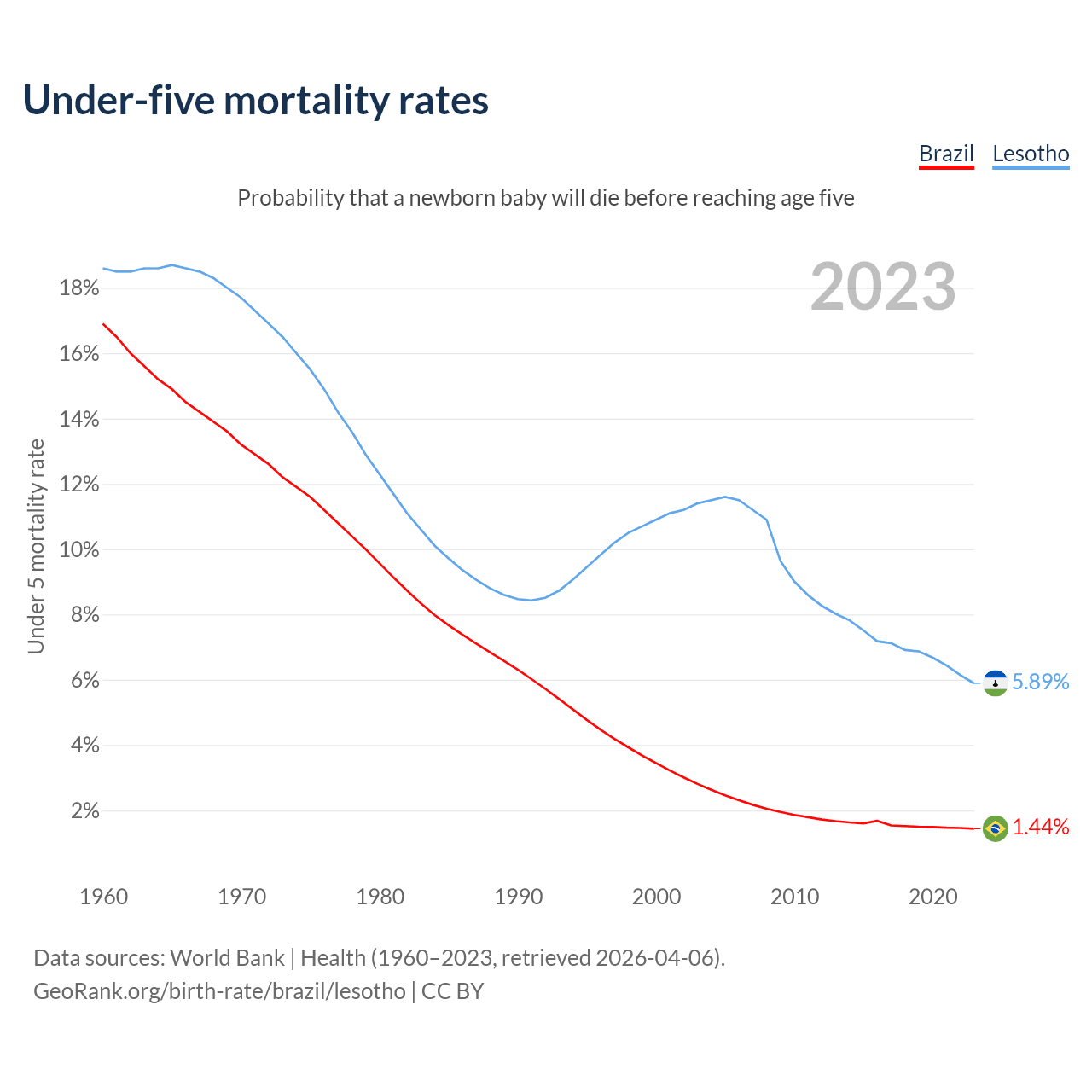 The chance that a newborn baby will die before reaching age five is 1.44% in Brazil and 5.89% in Lesotho. Above is a chart with historical data on under-five mortality rates.