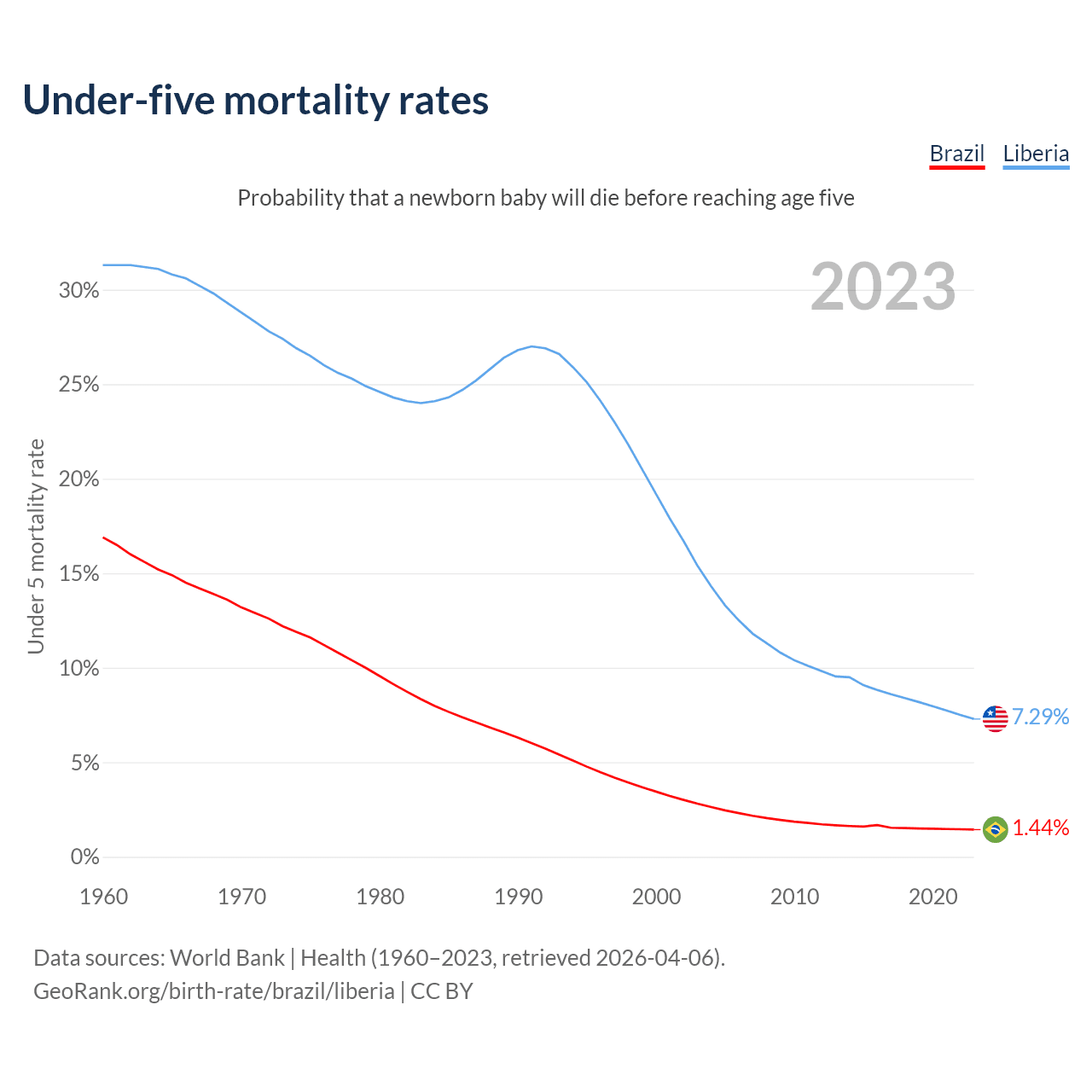 The chance that a newborn baby will die before reaching age five is 1.44% in Brazil and 7.29% in Liberia. Above is a chart with historical data on under-five mortality rates.