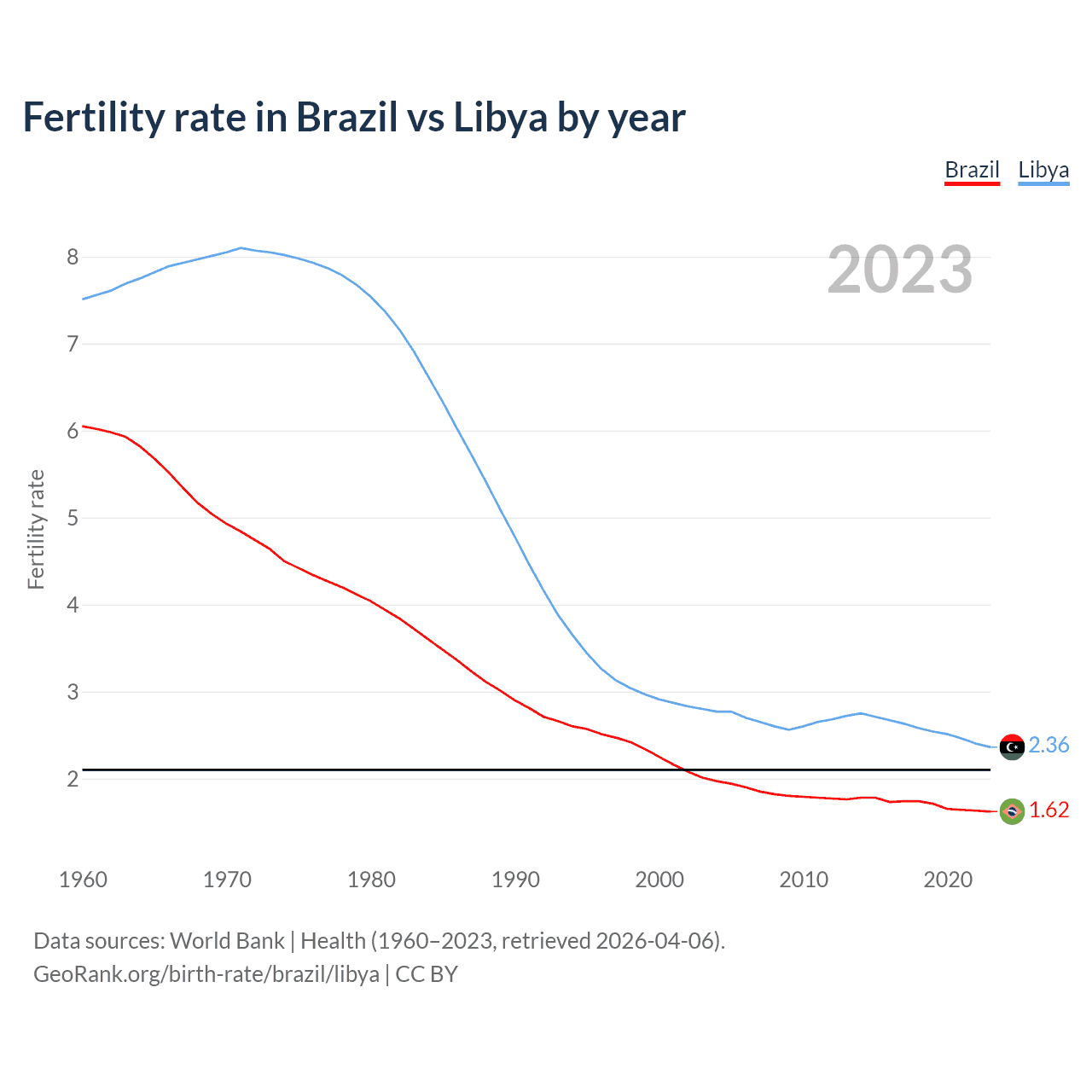 According to the latest available data on birth rates, the fertility rate in Brazil was 1.62 children per woman in 2023, compared to 2.36 in Libya in 2023. The replacement level is considered to be 2.1 children per woman.