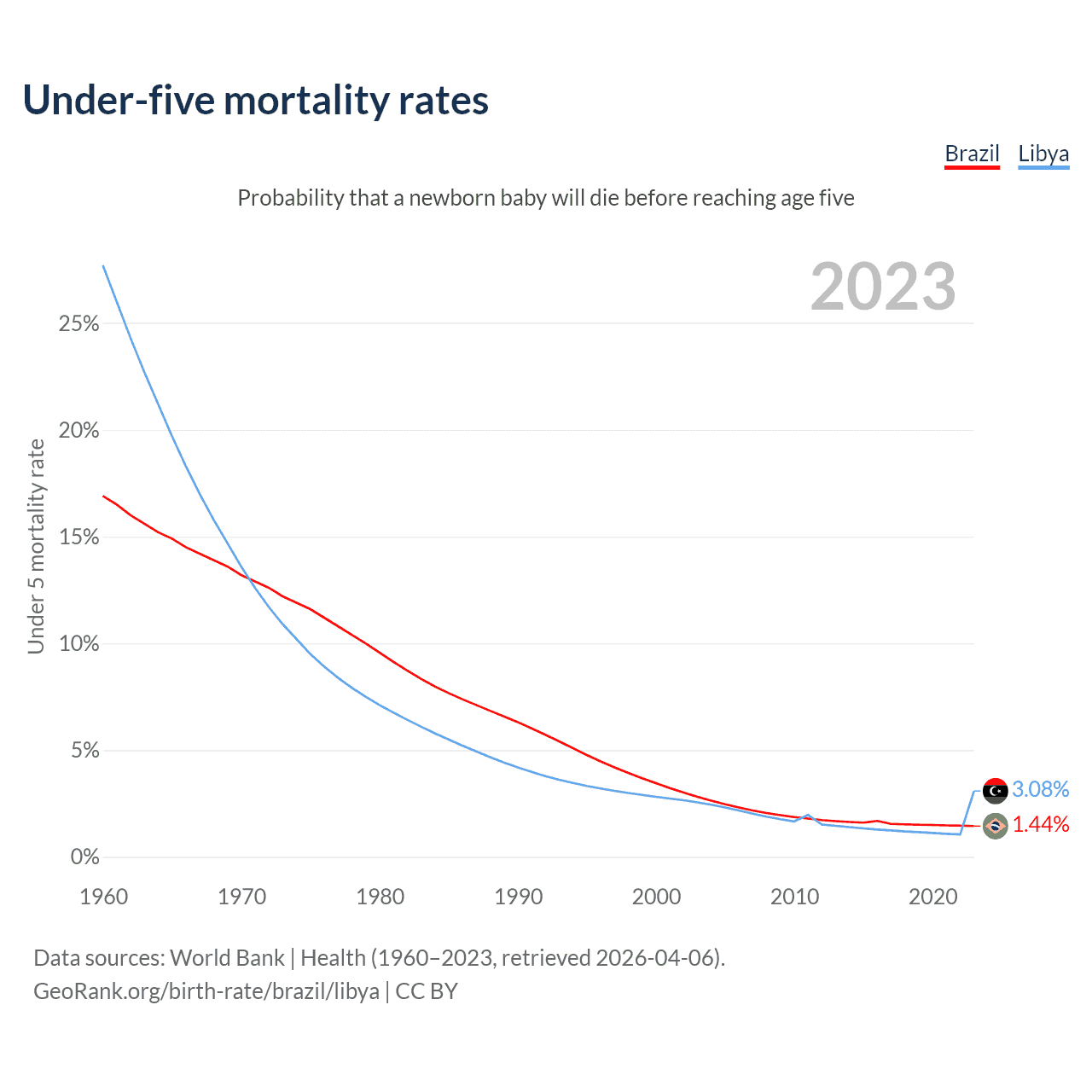 The chance that a newborn baby will die before reaching age five is 1.44% in Brazil and 3.08% in Libya. Above is a chart with historical data on under-five mortality rates.