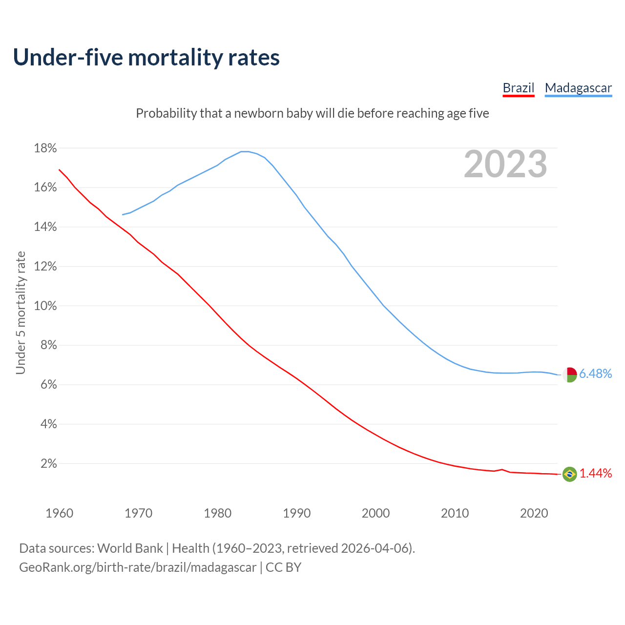 The chance that a newborn baby will die before reaching age five is 1.44% in Brazil and 6.48% in Madagascar. Above is a chart with historical data on under-five mortality rates.