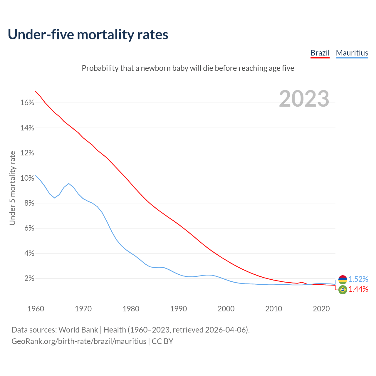 The chance that a newborn baby will die before reaching age five is 1.44% in Brazil and 1.52% in Mauritius. Above is a chart with historical data on under-five mortality rates.