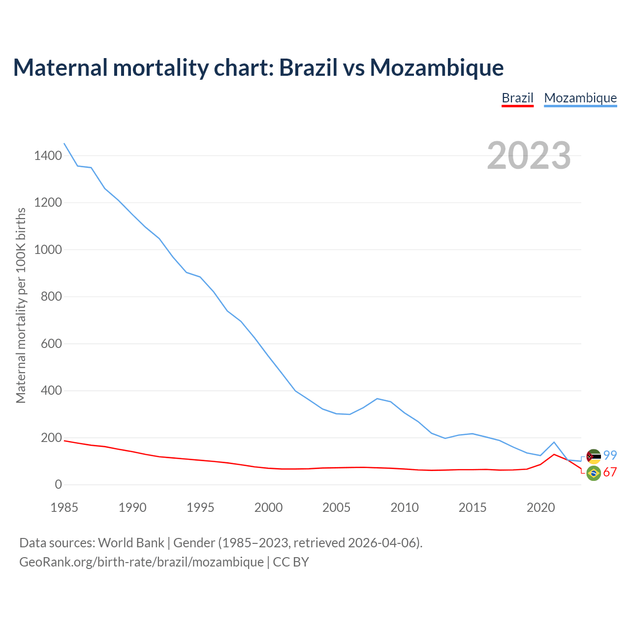 The maternal mortality rate, which is the probability of dying during childbirth or within 42 days of pregnancy termination, is 67 deaths per 100,000 live births in Brazil, compared to 99 deaths in Mozambique.