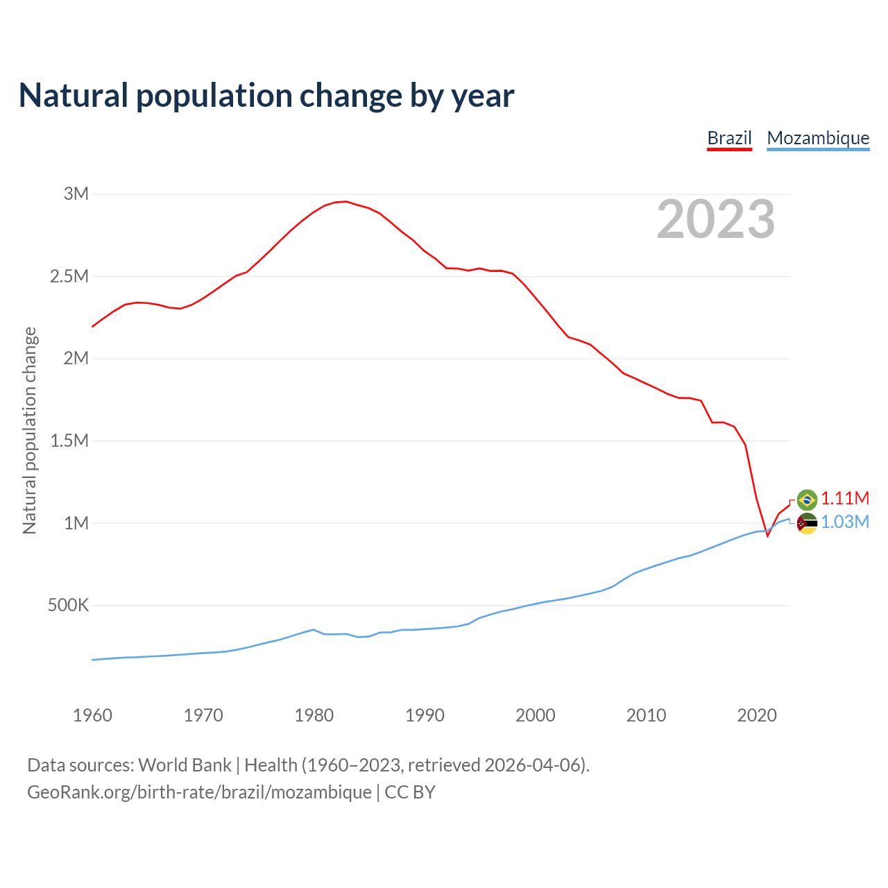1960 vs 2023, the fertility rate has decreased by 73.2% in Brazil and by 24.5% in Mozambique — in 1960, it was 6.05 and 6.31, respectively.