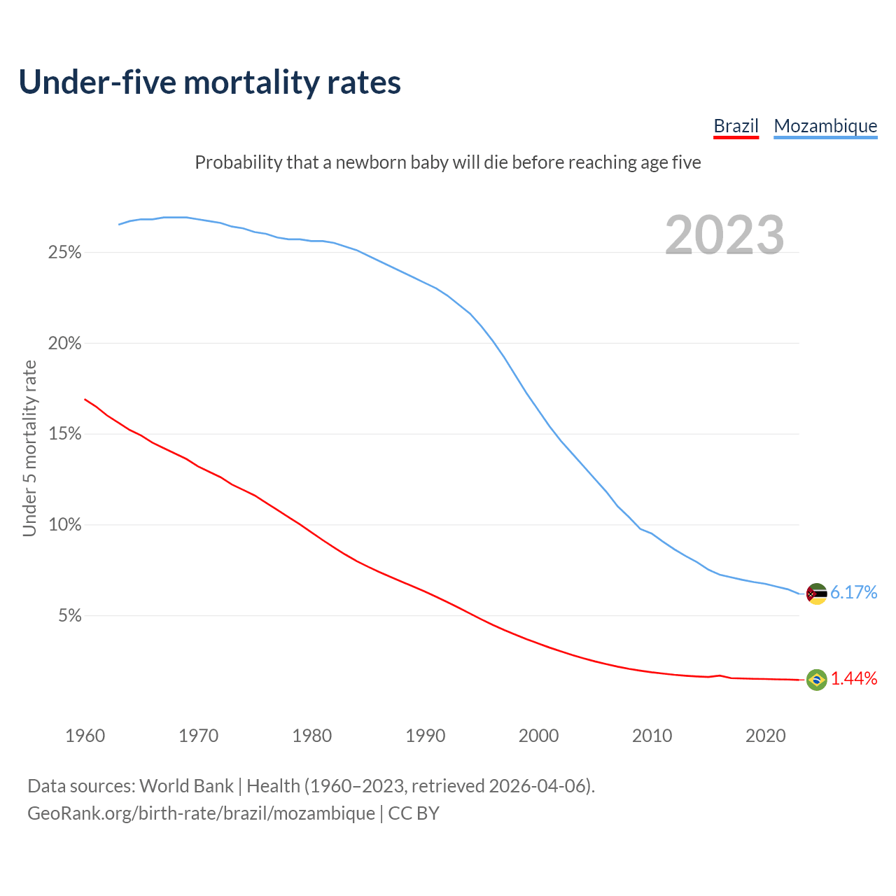 The chance that a newborn baby will die before reaching age five is 1.44% in Brazil and 6.17% in Mozambique. Above is a chart with historical data on under-five mortality rates.