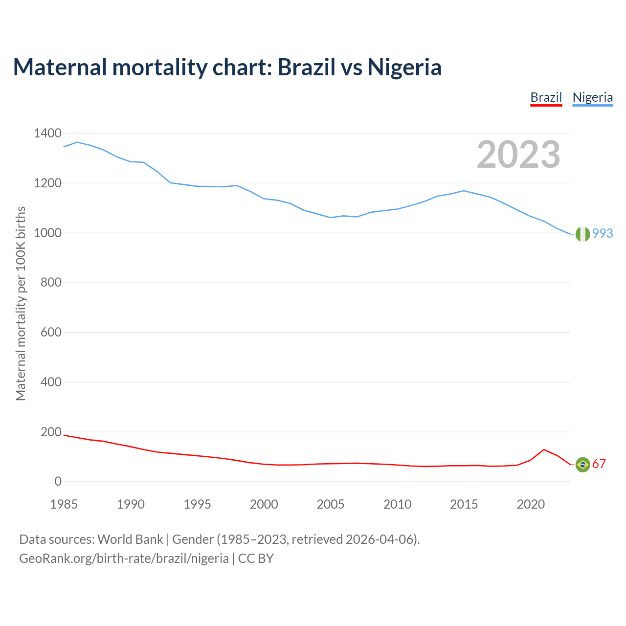 The maternal mortality rate, which is the probability of dying during childbirth or within 42 days of pregnancy termination, is 67 deaths per 100,000 live births in Brazil, compared to 993 deaths in Nigeria.