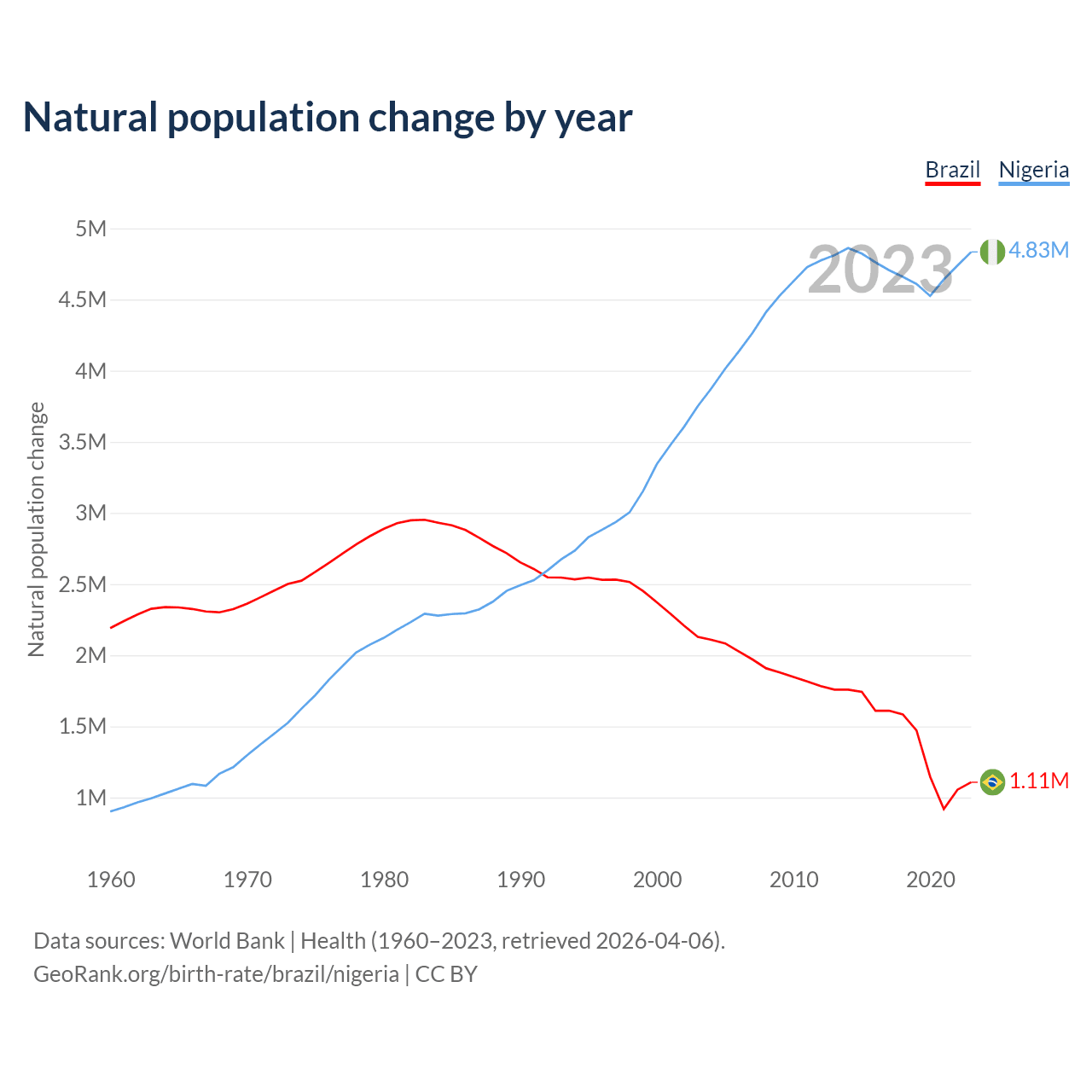 According to the latest available data on birth rates, the fertility rate in Brazil was 1.62 children per woman in 2023, compared to 4.48 in Nigeria in 2023. The replacement level is considered to be 2.1 children per woman.