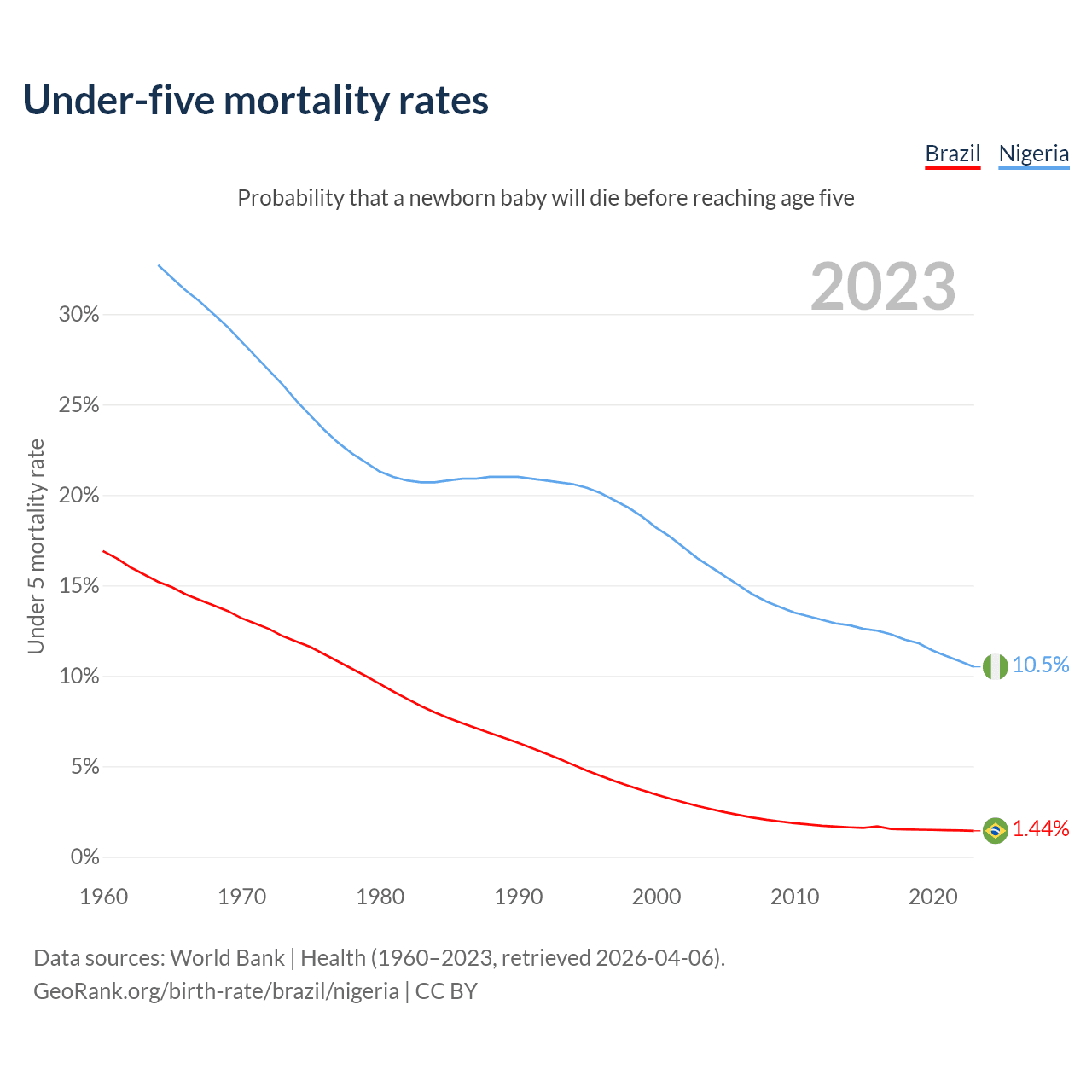 The chance that a newborn baby will die before reaching age five is 1.44% in Brazil and 10.5% in Nigeria. Above is a chart with historical data on under-five mortality rates.