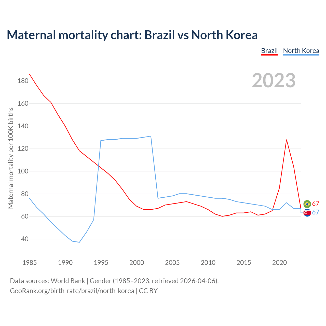 The maternal mortality rate, which is the probability of dying during childbirth or within 42 days of pregnancy termination, is 67 deaths per 100,000 live births in Brazil, compared to 67 deaths in North Korea.