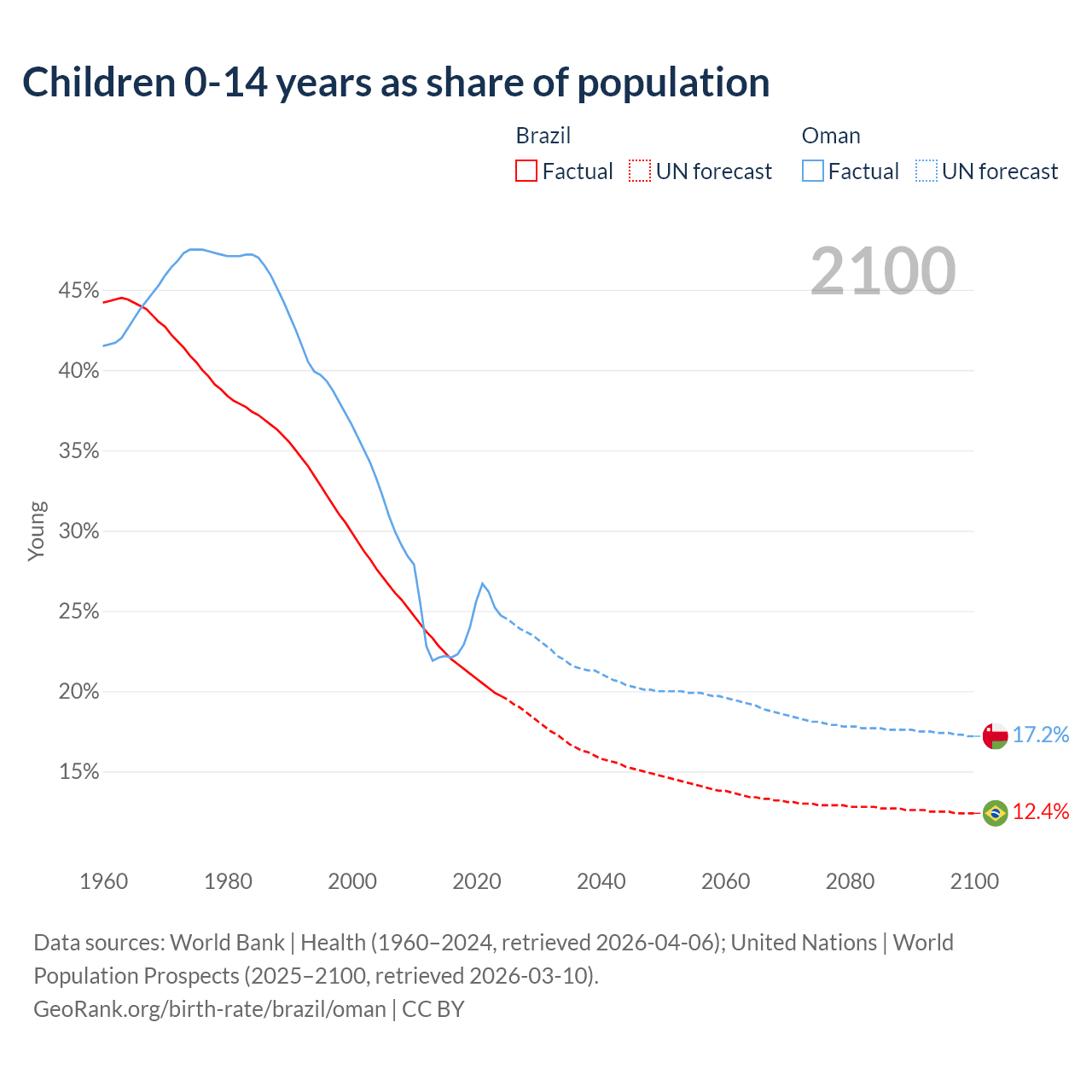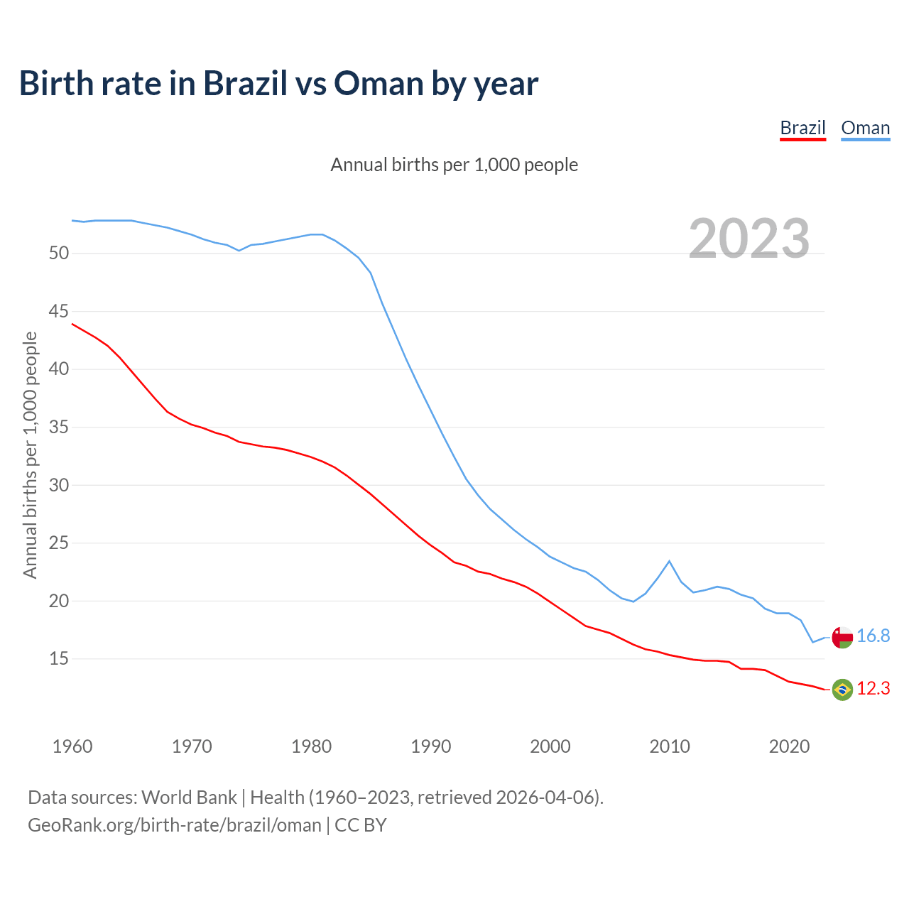 Brazil has an annual birth rate of 12.3 births per 1,000 people, compared to 16.8 for Oman. The average number of children a woman is expected to have during her lifetime — the fertility rate, is 1.62 in Brazil and 2.53 in Oman — 56% difference.