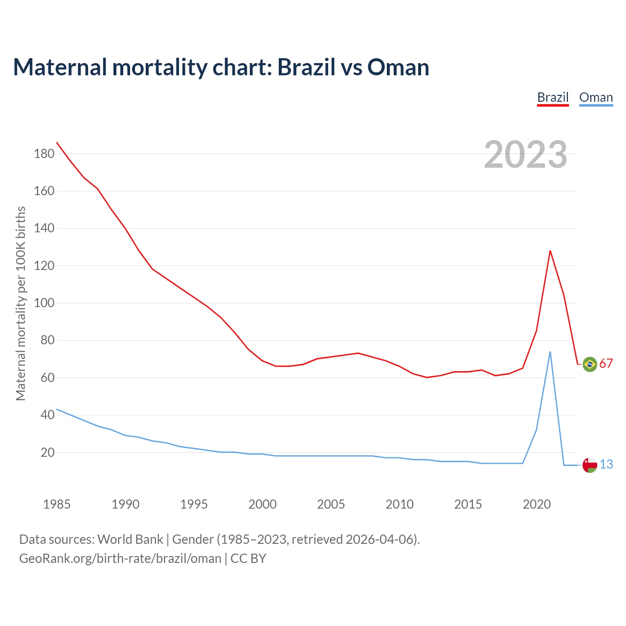 The maternal mortality rate, which is the probability of dying during childbirth or within 42 days of pregnancy termination, is 67 deaths per 100,000 live births in Brazil, compared to 13 deaths in Oman.