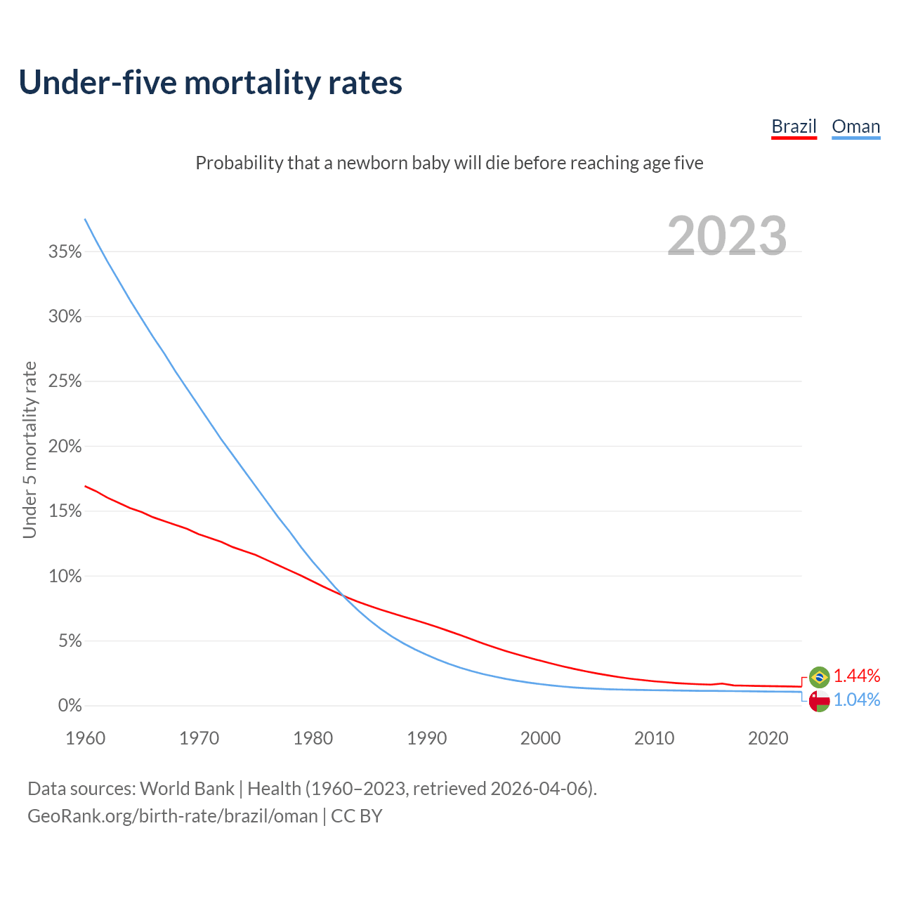 The chance that a newborn baby will die before reaching age five is 1.44% in Brazil and 1.04% in Oman. Above is a chart with historical data on under-five mortality rates.
