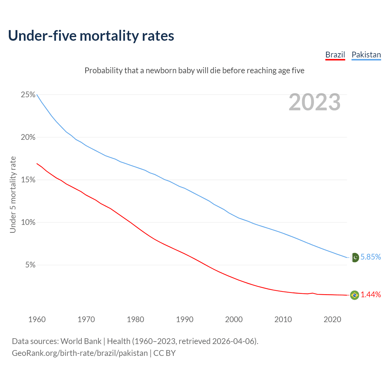 The chance that a newborn baby will die before reaching age five is 1.44% in Brazil and 5.85% in Pakistan. Above is a chart with historical data on under-five mortality rates.