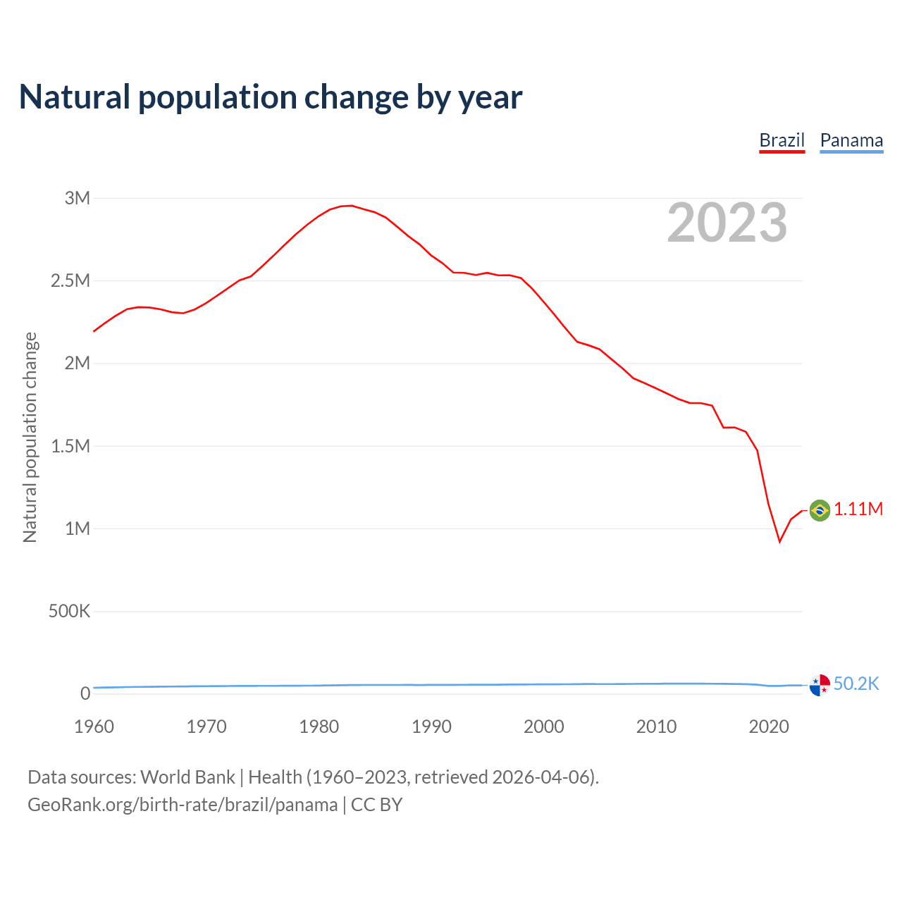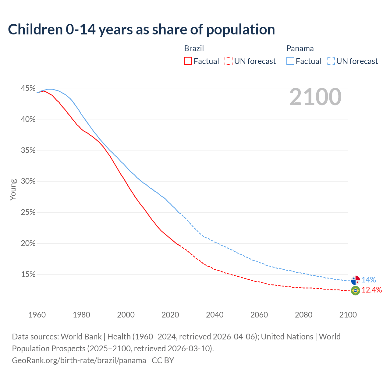 1960 vs 2023, the fertility rate has decreased by 73.2% in Brazil and by 63.6% in Panama — in 1960, it was 6.05 and 5.83, respectively.