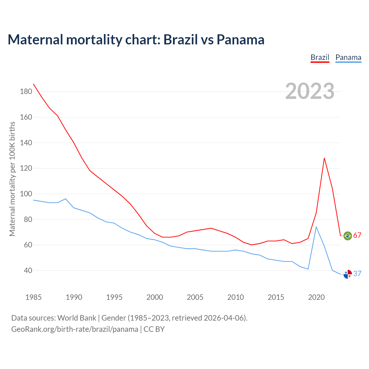 The maternal mortality rate, which is the probability of dying during childbirth or within 42 days of pregnancy termination, is 67 deaths per 100,000 live births in Brazil, compared to 37 deaths in Panama.