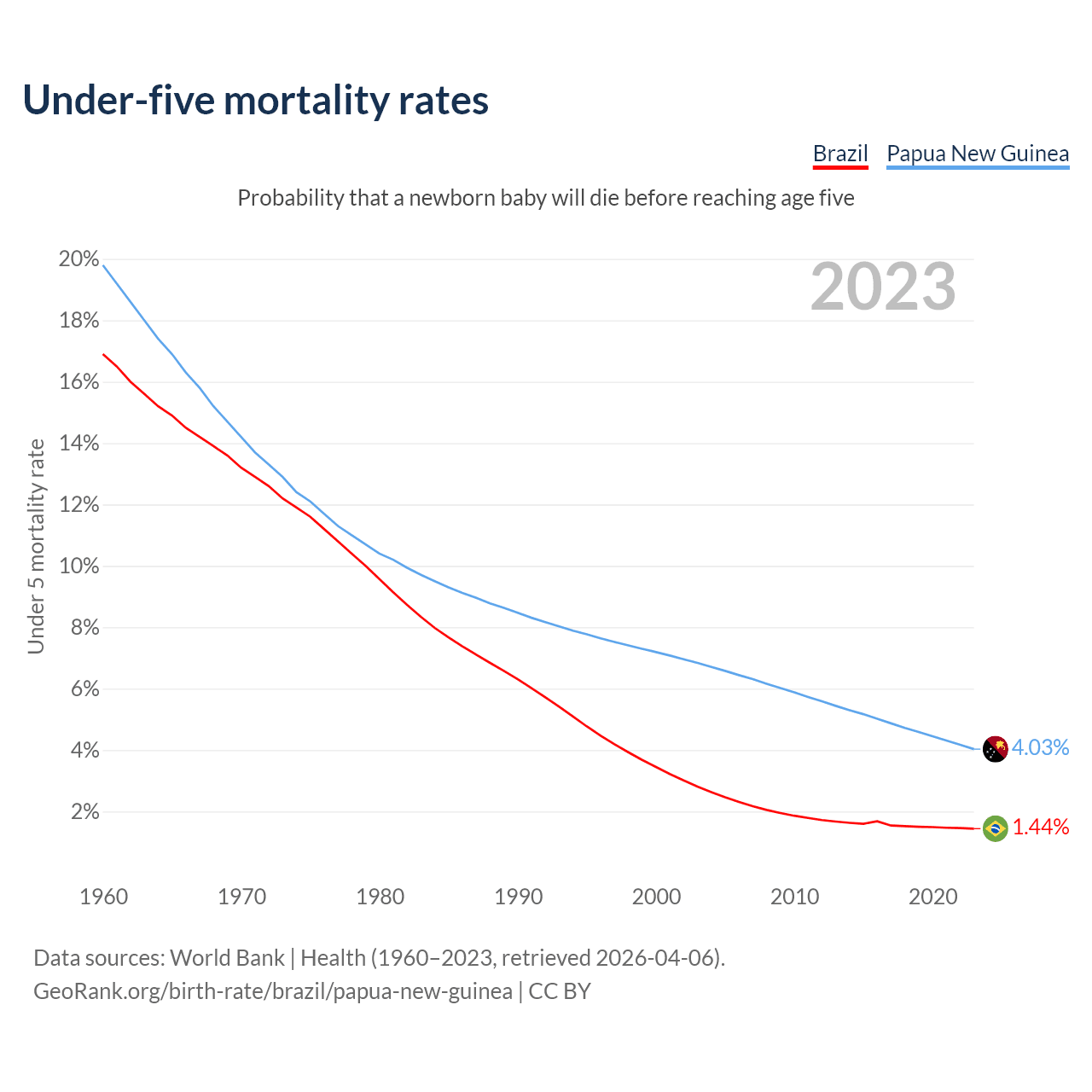 The chance that a newborn baby will die before reaching age five is 1.44% in Brazil and 4.03% in Papua New Guinea. Above is a chart with historical data on under-five mortality rates.