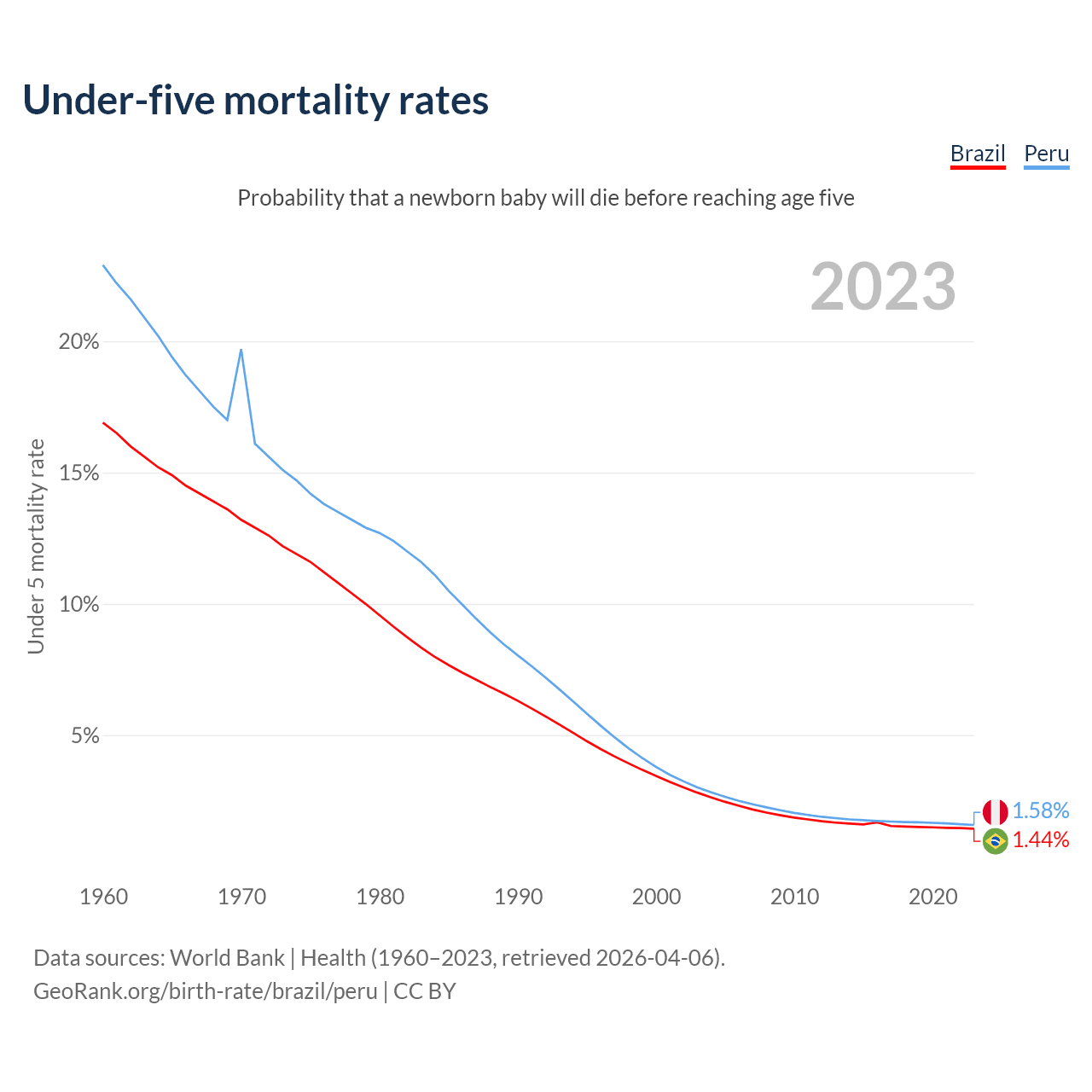 The chance that a newborn baby will die before reaching age five is 1.44% in Brazil and 1.58% in Peru. Above is a chart with historical data on under-five mortality rates.