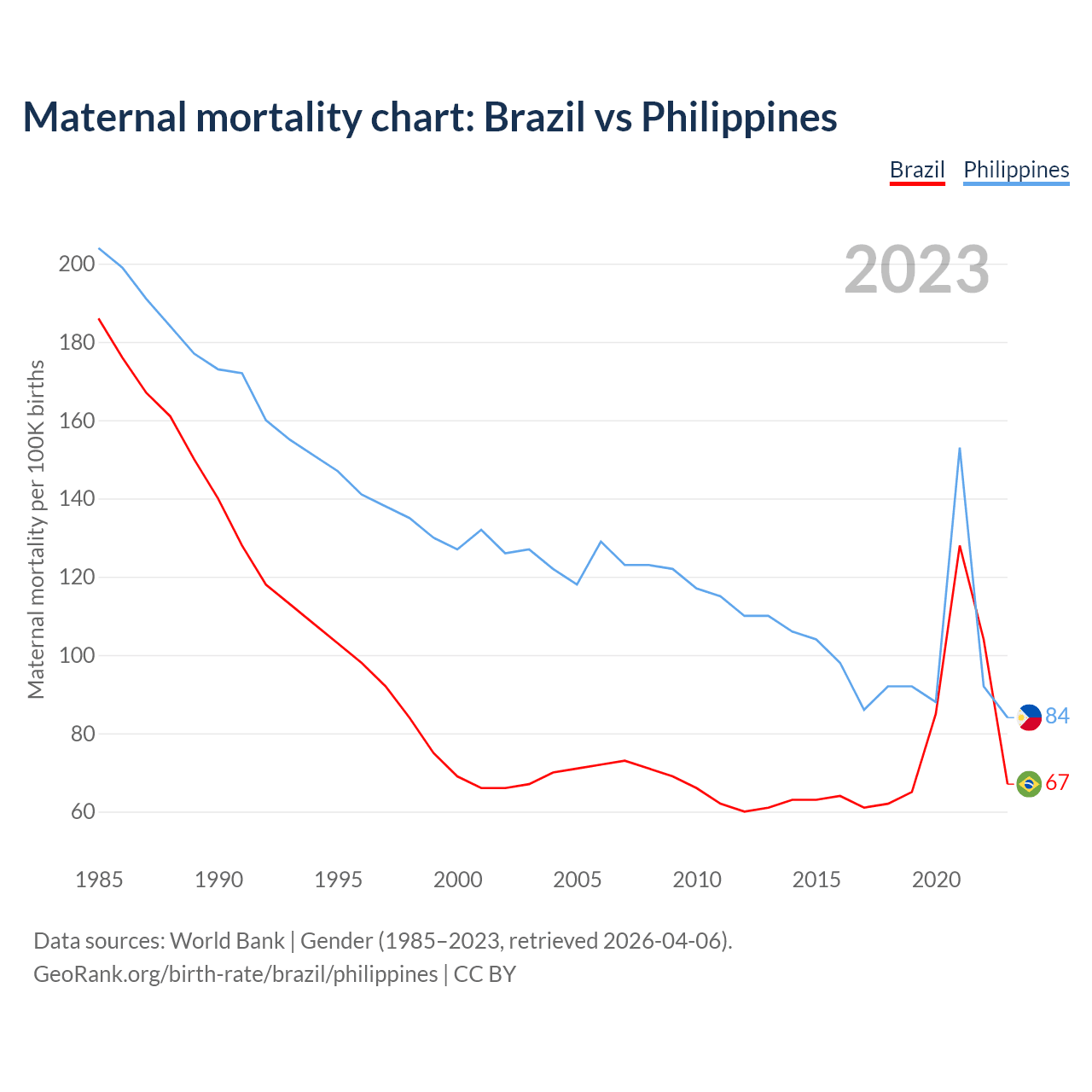 The maternal mortality rate, which is the probability of dying during childbirth or within 42 days of pregnancy termination, is 67 deaths per 100,000 live births in Brazil, compared to 84 deaths in the Philippines.