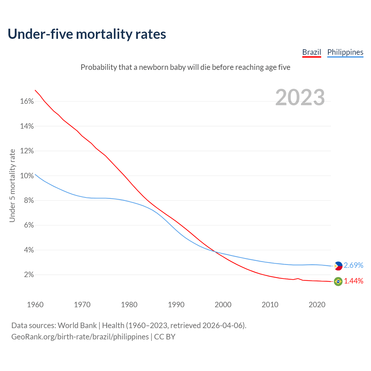 The chance that a newborn baby will die before reaching age five is 1.44% in Brazil and 2.69% in the Philippines. Above is a chart with historical data on under-five mortality rates.