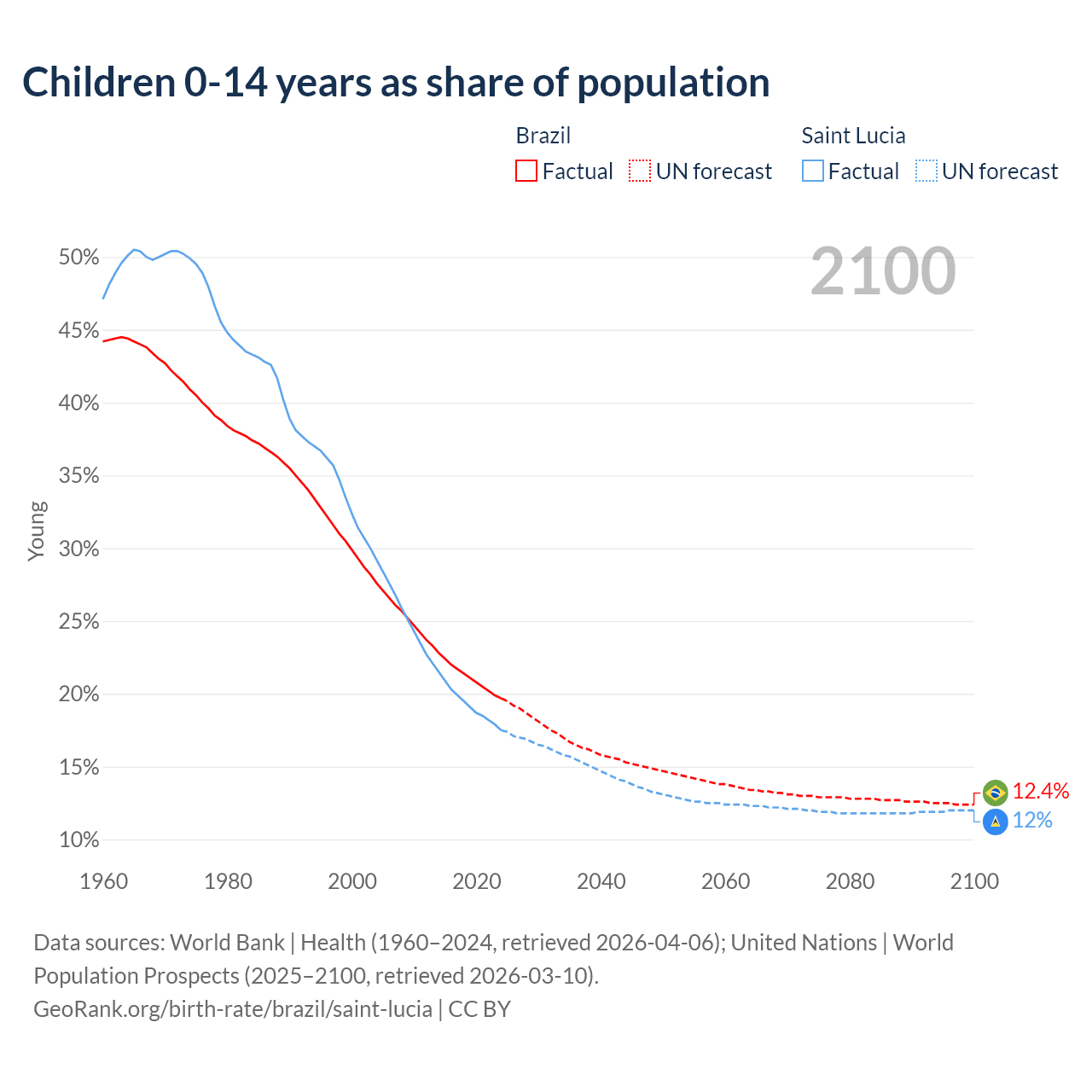 According to the latest available data on birth rates, the fertility rate in Brazil was 1.62 children per woman in 2023, compared to 1.38 in Saint Lucia in 2023. The replacement level is considered to be 2.1 children per woman.