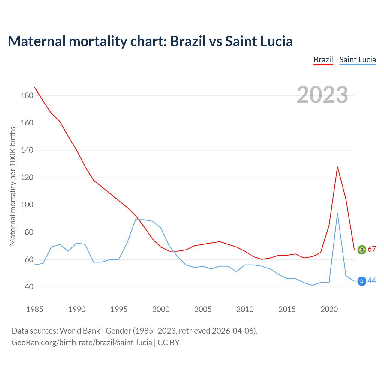 The maternal mortality rate, which is the probability of dying during childbirth or within 42 days of pregnancy termination, is 67 deaths per 100,000 live births in Brazil, compared to 44 deaths in Saint Lucia.