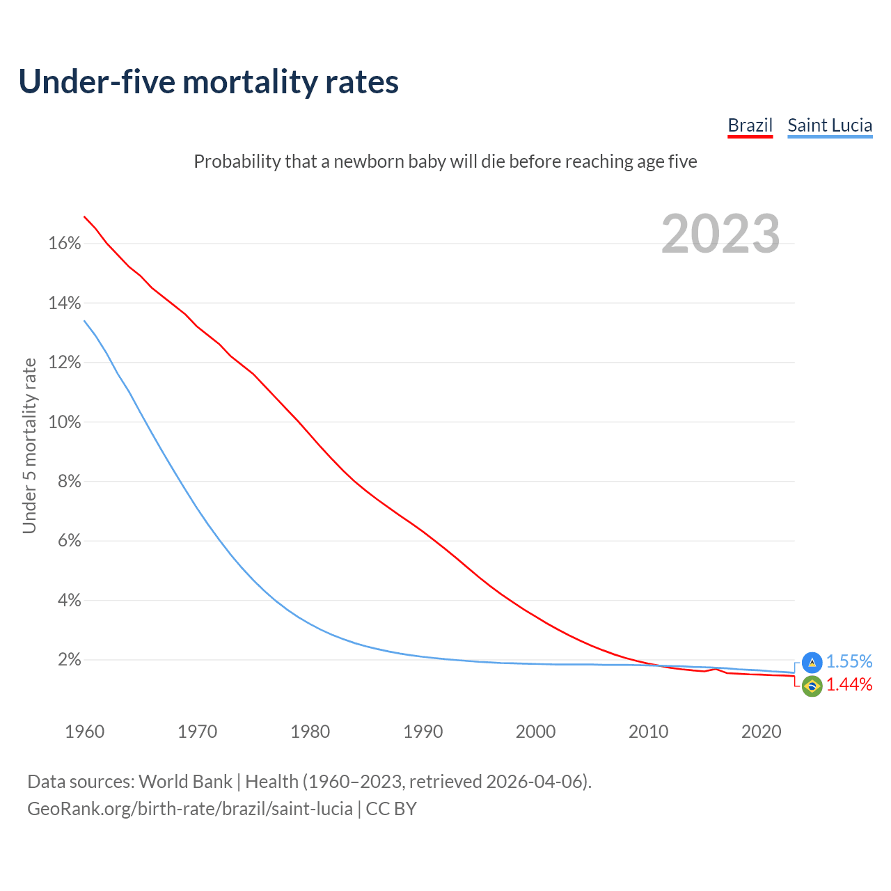 The chance that a newborn baby will die before reaching age five is 1.44% in Brazil and 1.55% in Saint Lucia. Above is a chart with historical data on under-five mortality rates.
