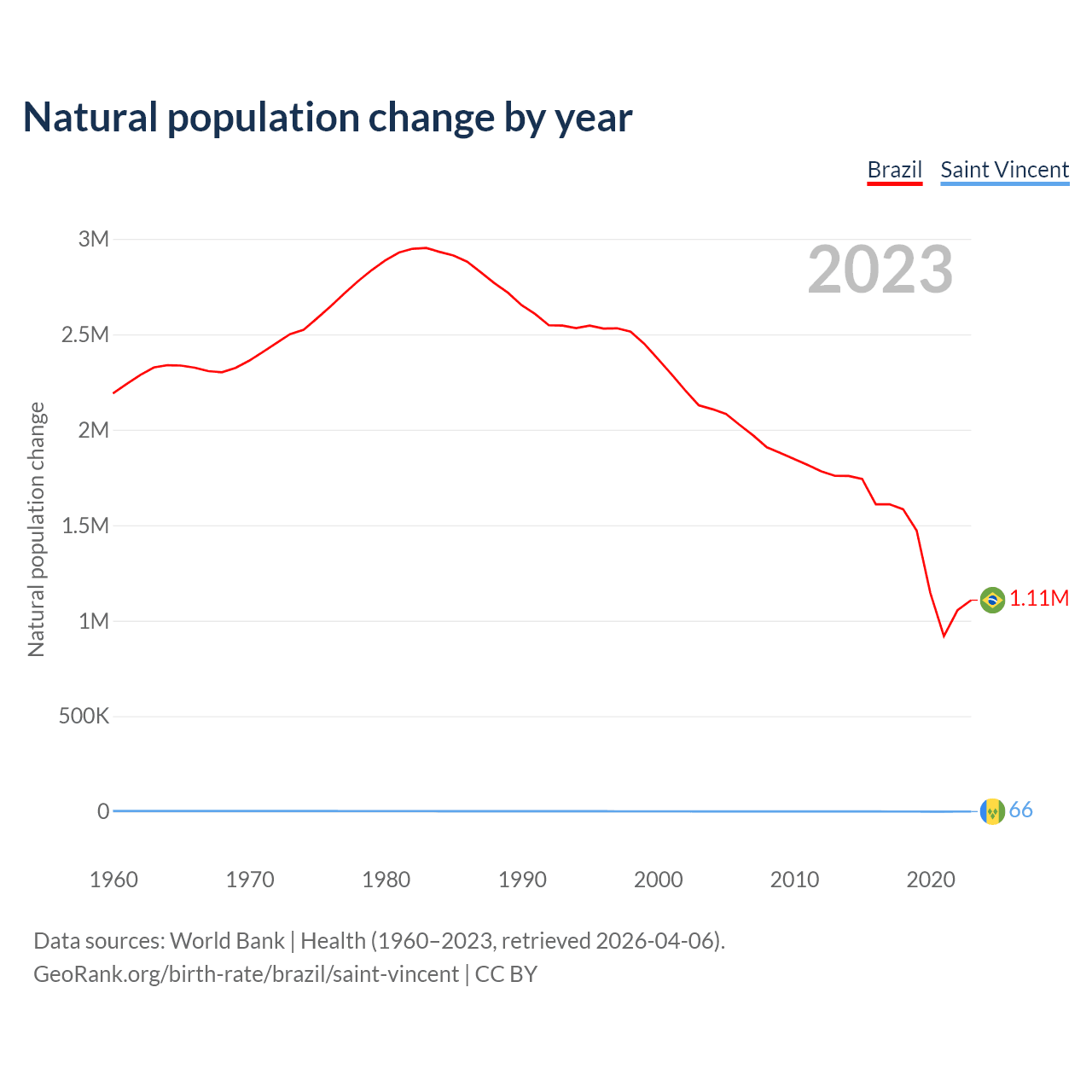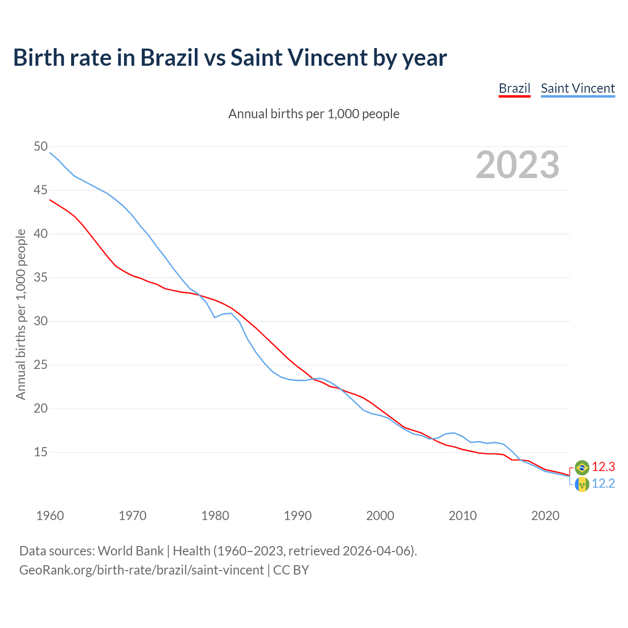 Brazil has an annual birth rate of 12.3 births per 1,000 people, compared to 12.2 for Saint Vincent. The average number of children a woman is expected to have during her lifetime — the fertility rate, is 1.62 in Brazil and 1.78 in Saint Vincent — 9.64% difference.
