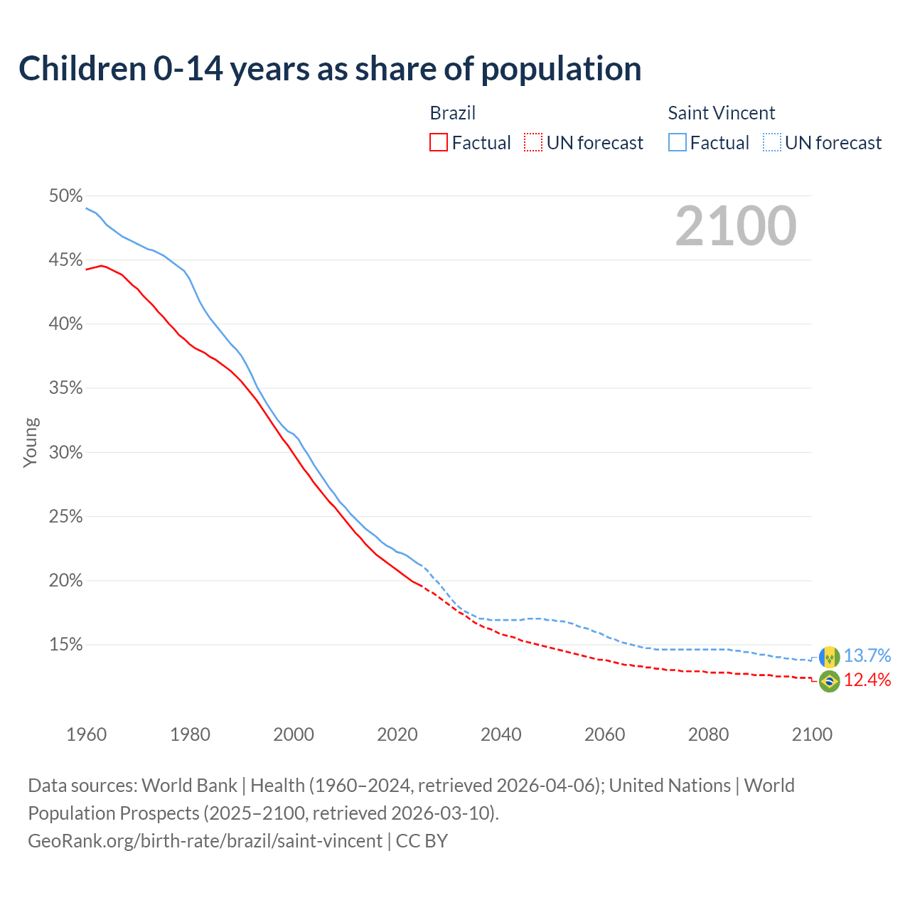 According to the latest available data on birth rates, the fertility rate in Brazil was 1.62 children per woman in 2023, compared to 1.78 in Saint Vincent in 2023. The replacement level is considered to be 2.1 children per woman.