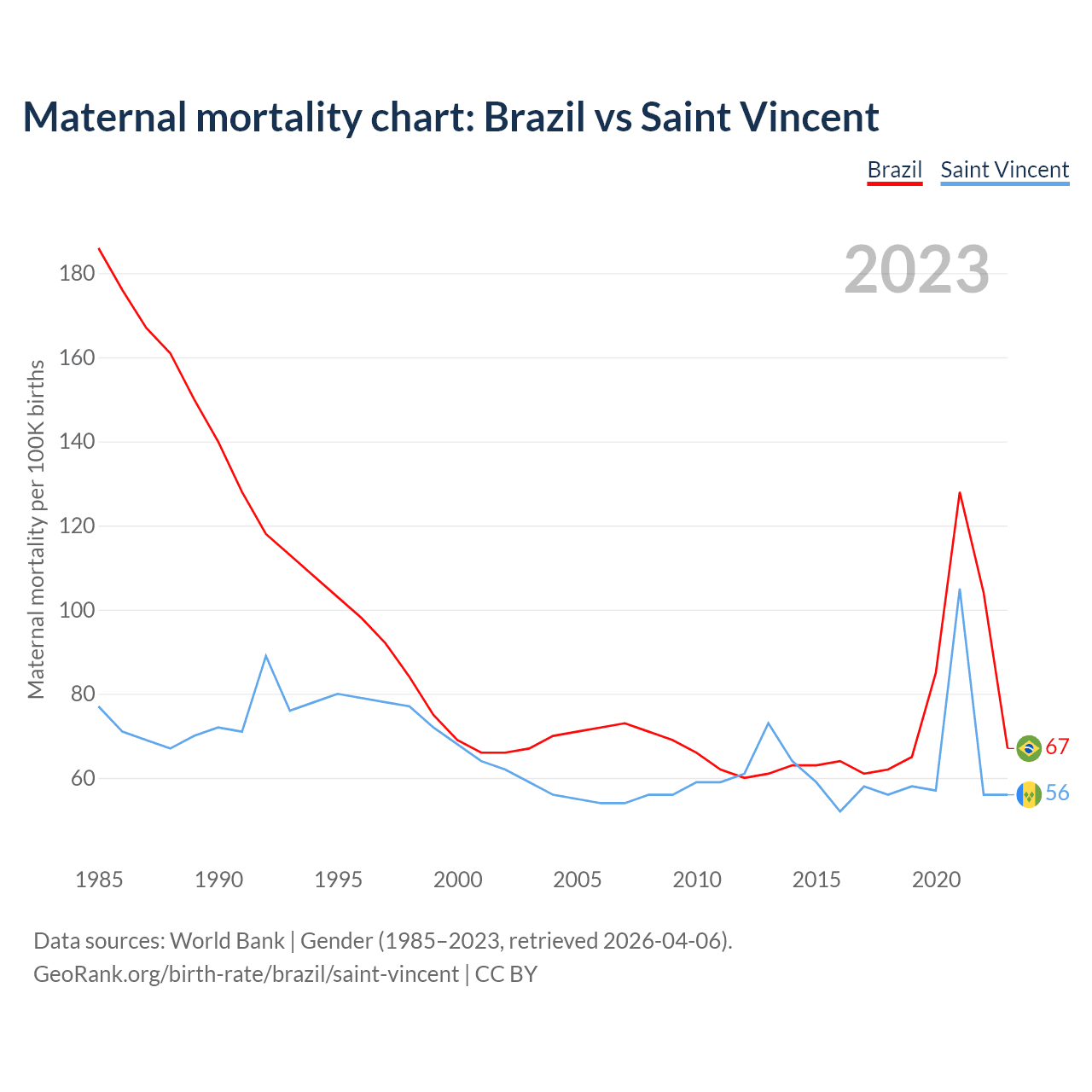 The maternal mortality rate, which is the probability of dying during childbirth or within 42 days of pregnancy termination, is 67 deaths per 100,000 live births in Brazil, compared to 56 deaths in Saint Vincent.