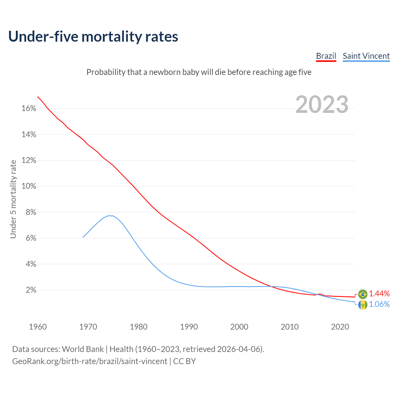 The chance that a newborn baby will die before reaching age five is 1.44% in Brazil and 1.06% in Saint Vincent. Above is a chart with historical data on under-five mortality rates.