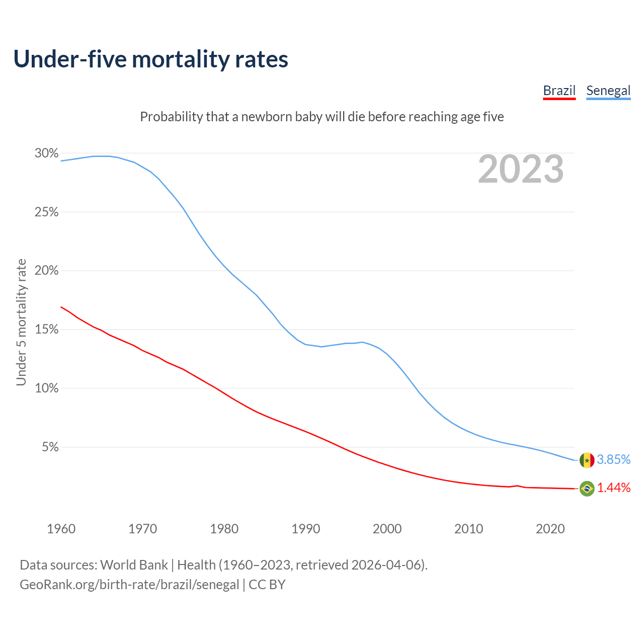 The chance that a newborn baby will die before reaching age five is 1.44% in Brazil and 3.85% in Senegal. Above is a chart with historical data on under-five mortality rates.