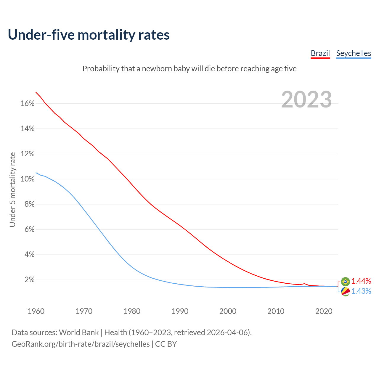The chance that a newborn baby will die before reaching age five is 1.44% in Brazil and 1.43% in the Seychelles. Above is a chart with historical data on under-five mortality rates.