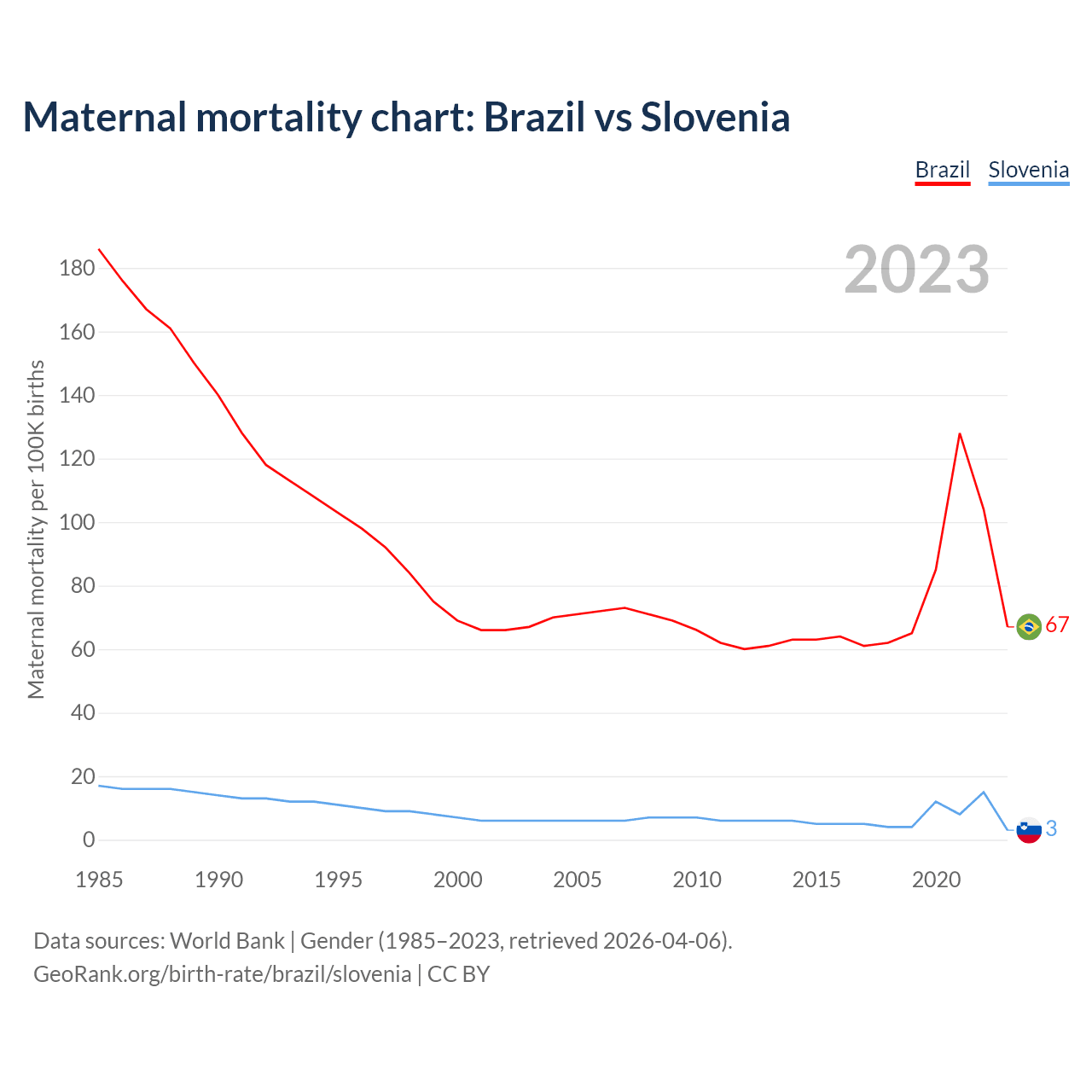 The maternal mortality rate, which is the probability of dying during childbirth or within 42 days of pregnancy termination, is 67 deaths per 100,000 live births in Brazil, compared to 3 deaths in Slovenia.