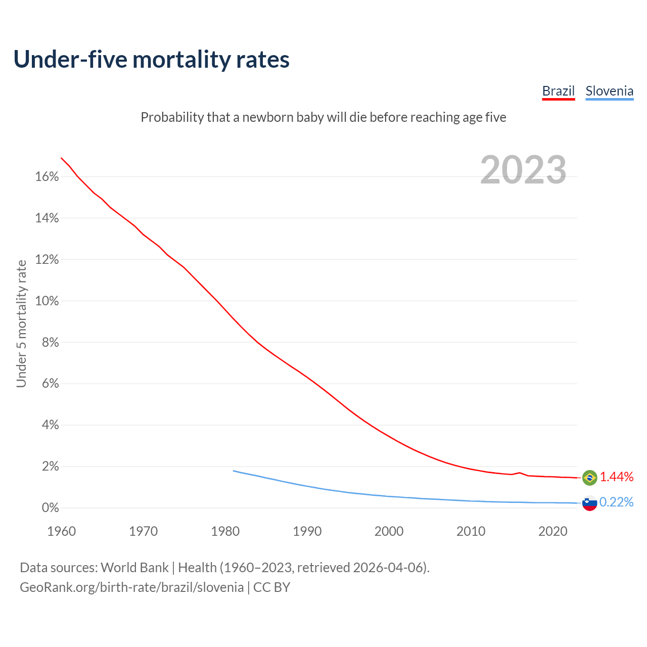 The chance that a newborn baby will die before reaching age five is 1.44% in Brazil and 0.22% in Slovenia. Above is a chart with historical data on under-five mortality rates.