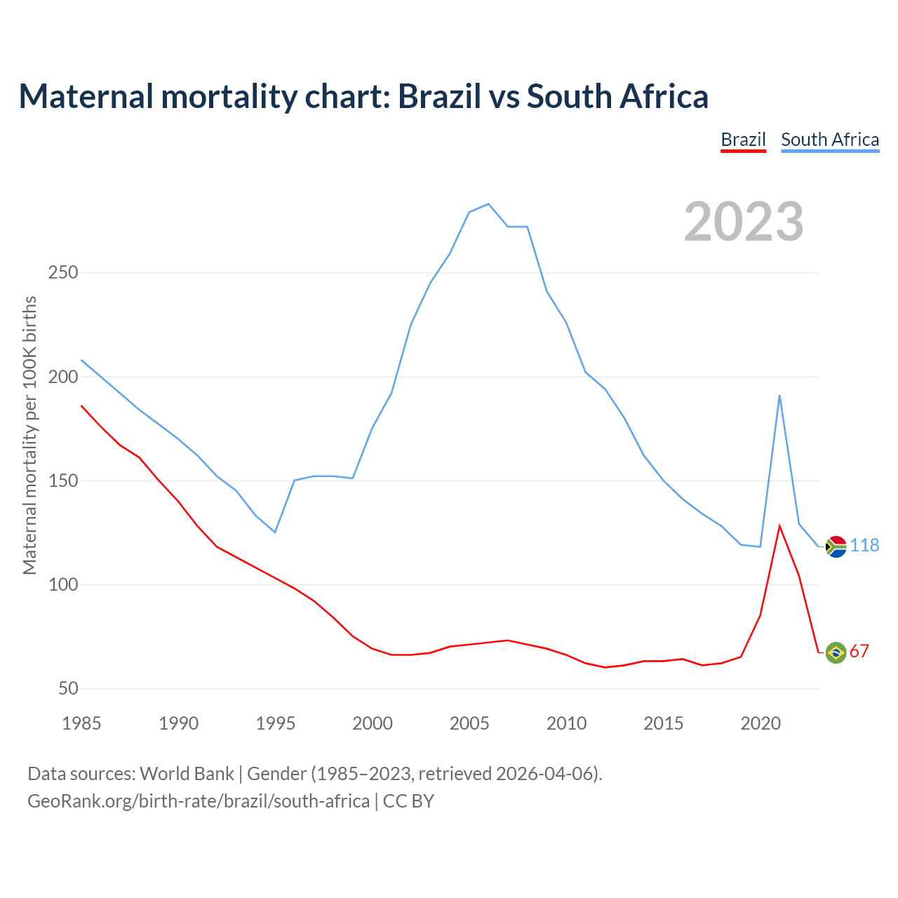 The maternal mortality rate, which is the probability of dying during childbirth or within 42 days of pregnancy termination, is 67 deaths per 100,000 live births in Brazil, compared to 118 deaths in South Africa.