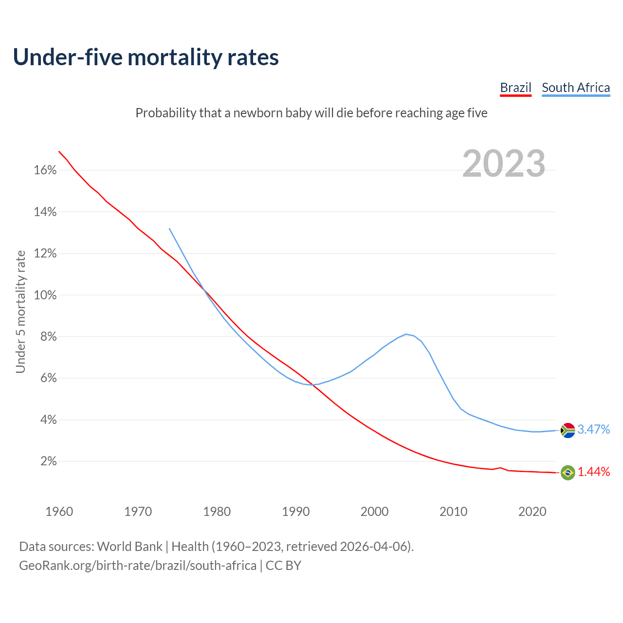 The chance that a newborn baby will die before reaching age five is 1.44% in Brazil and 3.47% in South Africa. Above is a chart with historical data on under-five mortality rates.