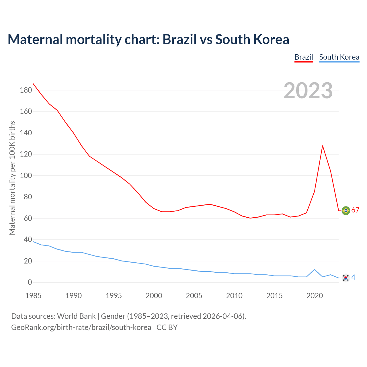 The maternal mortality rate, which is the probability of dying during childbirth or within 42 days of pregnancy termination, is 67 deaths per 100,000 live births in Brazil, compared to 4 deaths in South Korea.