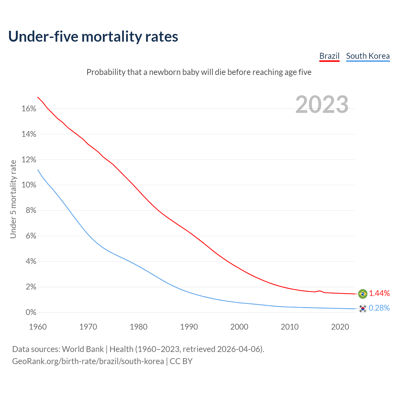 The chance that a newborn baby will die before reaching age five is 1.44% in Brazil and 0.28% in South Korea. Above is a chart with historical data on under-five mortality rates.