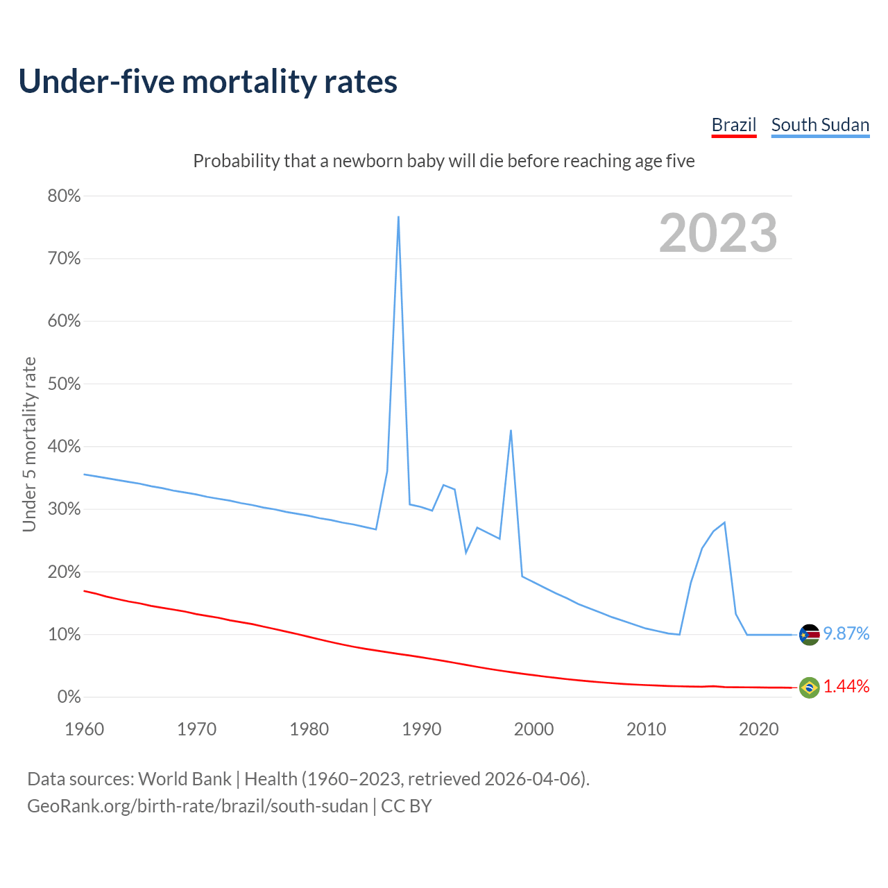 The chance that a newborn baby will die before reaching age five is 1.44% in Brazil and 9.87% in South Sudan. Above is a chart with historical data on under-five mortality rates.