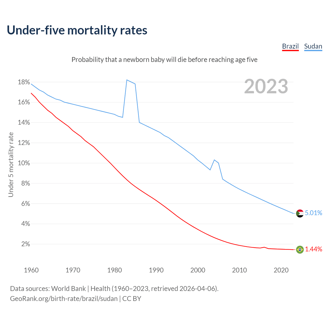 The chance that a newborn baby will die before reaching age five is 1.44% in Brazil and 5.01% in Sudan. Above is a chart with historical data on under-five mortality rates.