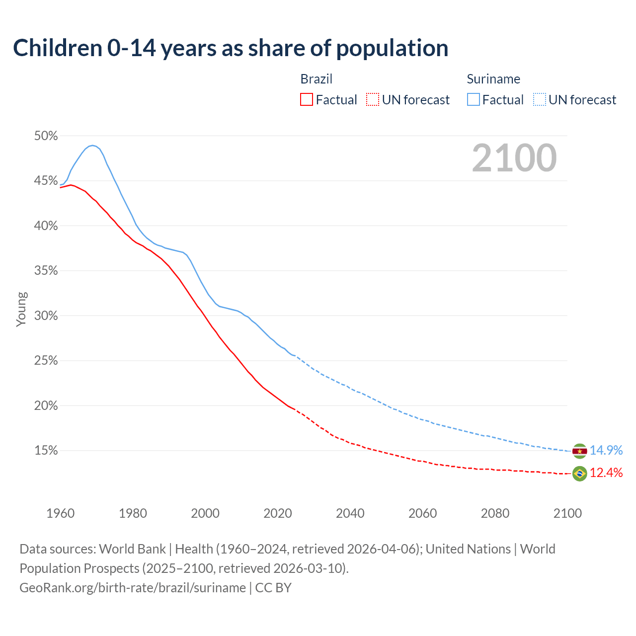 1960 vs 2023, the fertility rate has decreased by 73.2% in Brazil and by 65.9% in Suriname — in 1960, it was 6.05 and 6.59, respectively.