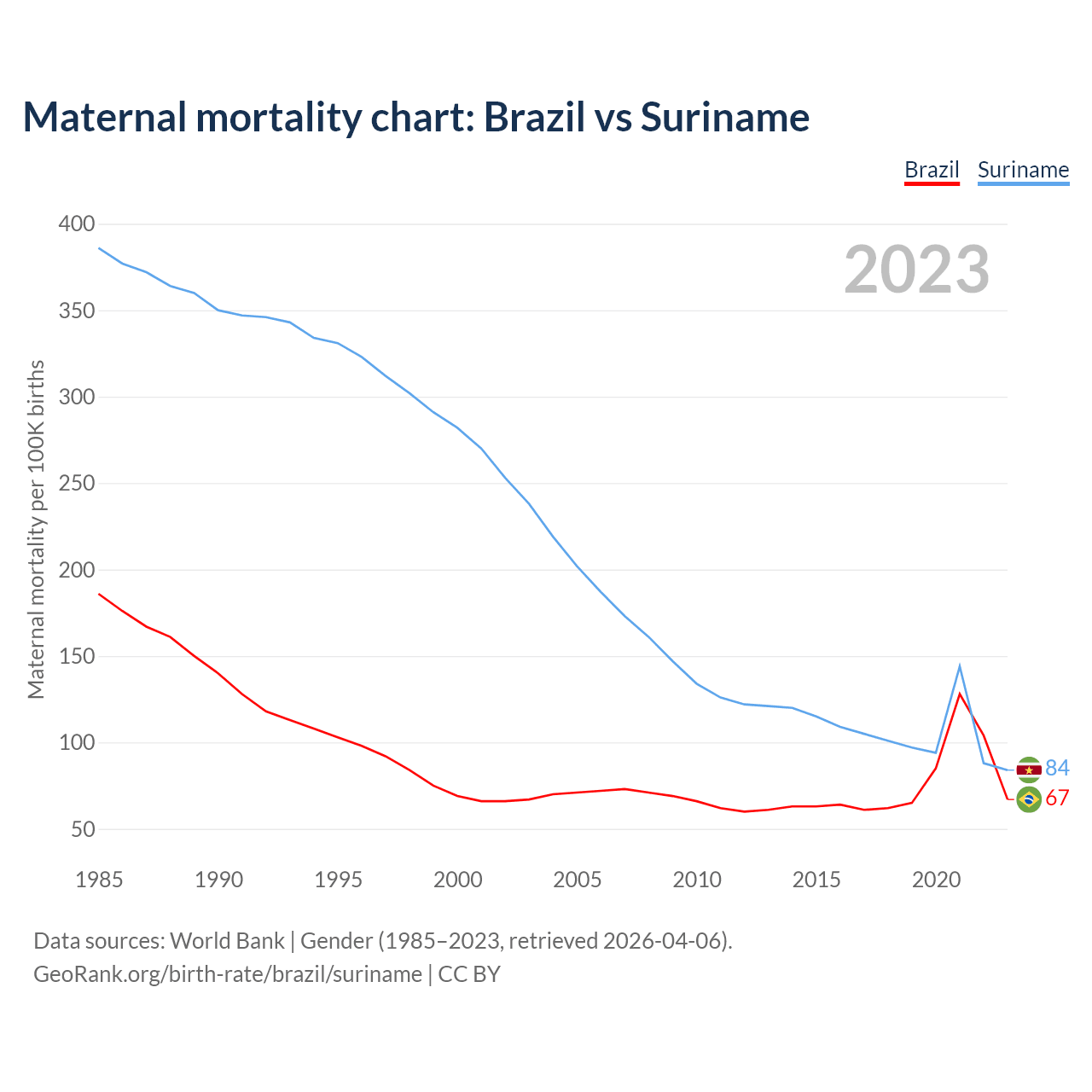 The maternal mortality rate, which is the probability of dying during childbirth or within 42 days of pregnancy termination, is 67 deaths per 100,000 live births in Brazil, compared to 84 deaths in Suriname.