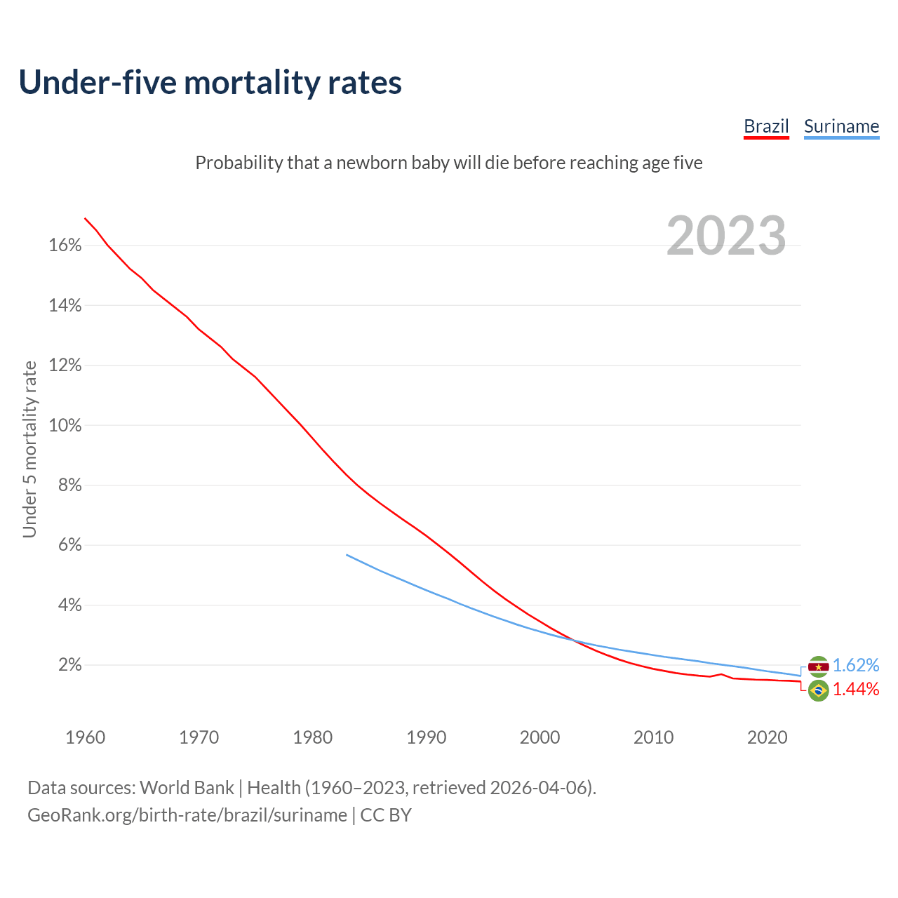 The chance that a newborn baby will die before reaching age five is 1.44% in Brazil and 1.62% in Suriname. Above is a chart with historical data on under-five mortality rates.