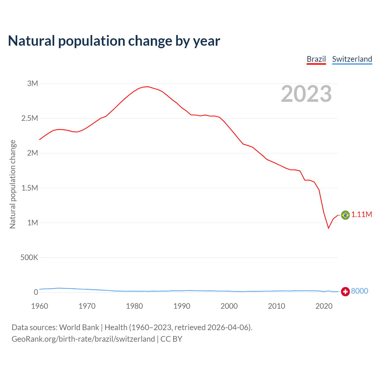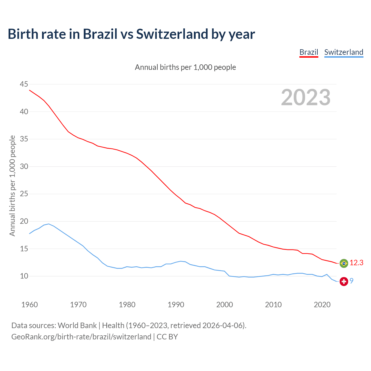According to the latest available data on birth rates, the fertility rate in Brazil was 1.62 children per woman in 2023, compared to 1.33 in Switzerland in 2023. The replacement level is considered to be 2.1 children per woman.